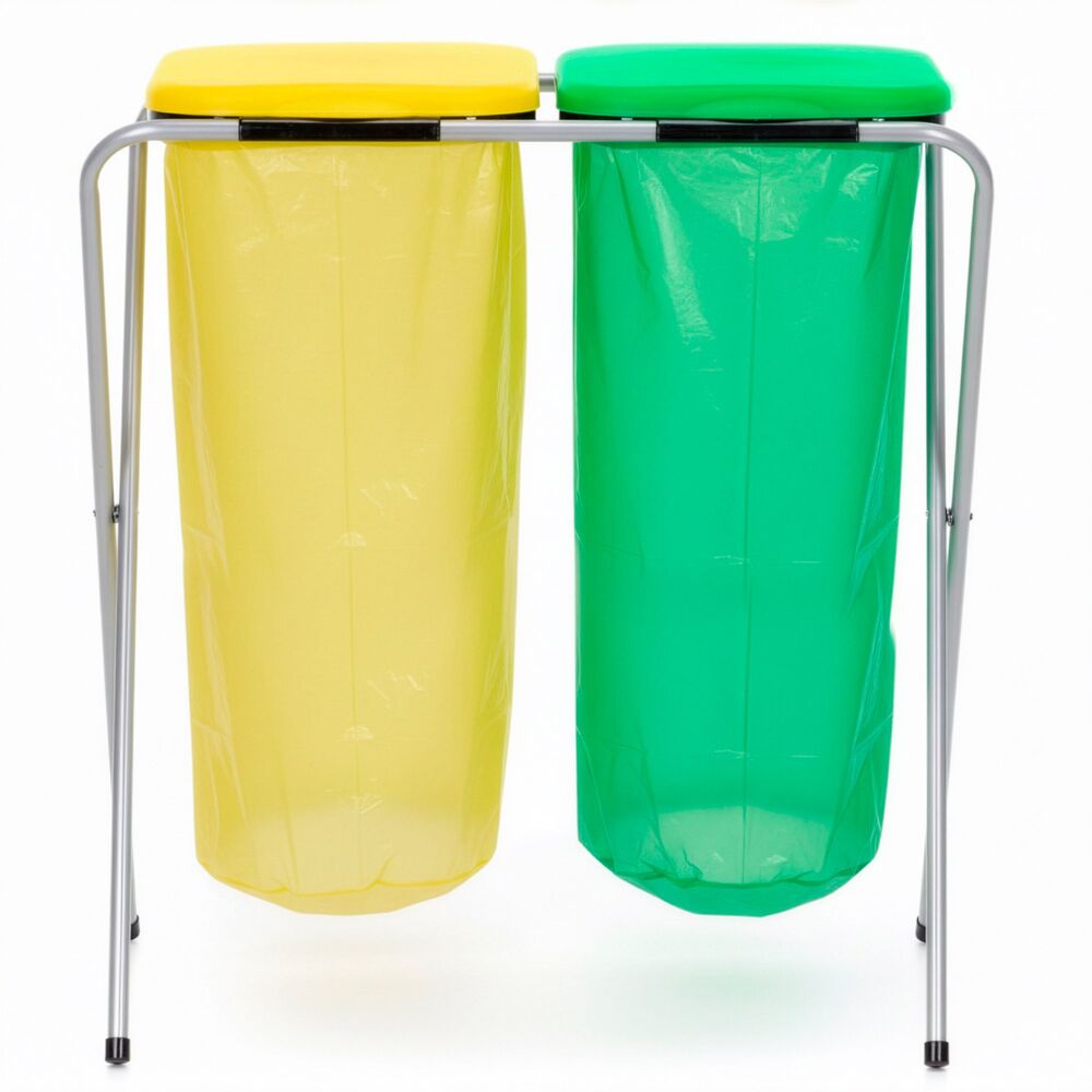 Praktické řešení pro přehledné třídění odpadu v domácnosti i venkovních prostorách. Dvě oddělené komory umožňují snadné rozdělení odpadu, barevné kryty usnadňují orientaci a zakrývají obsah pytlů. Lehká kovová konstrukce je stabilní, snadno přenositelná a díky protiskluzovým podložkám bezpečně stojí na různých površích. Výměna pytlů je rychlá a pohodlná.