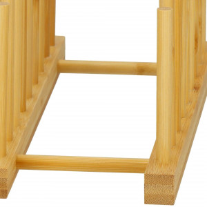Tento držák na talíře, pokličky nebo prkénka je vyroben z odolného bambusu, který je nejen pevný a stabilní, ale také ekologický a snadno se čistí. Bambusový materiál je známý svou dlouhou životností a odolností vůči vlhkosti, což z něj činí ideální volbu pro kuchyňské doplňky.