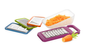 Dotaz na produkt4dílná sada struhadel se zásobníkem, délka 26 cm, šířka 10,2 cm, výška 10,8 cm, nerezová síta, mix barev - oranžová, růžová, zelená, modrá.