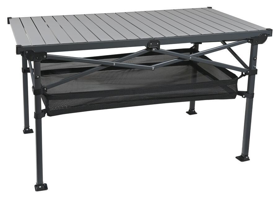 Robustní rám a nohy s možností uchycení k podkladu zajišťují stabilitu i na nerovném povrchu. Lamelová konstrukce desky umožňuje snadné složení i rozložení. Díky praktickému síťovanému odkládacímu prostoru budete mít drobnosti vždy po ruce. Po složení se stůl vejde pohodlně do auta nebo karavanu.