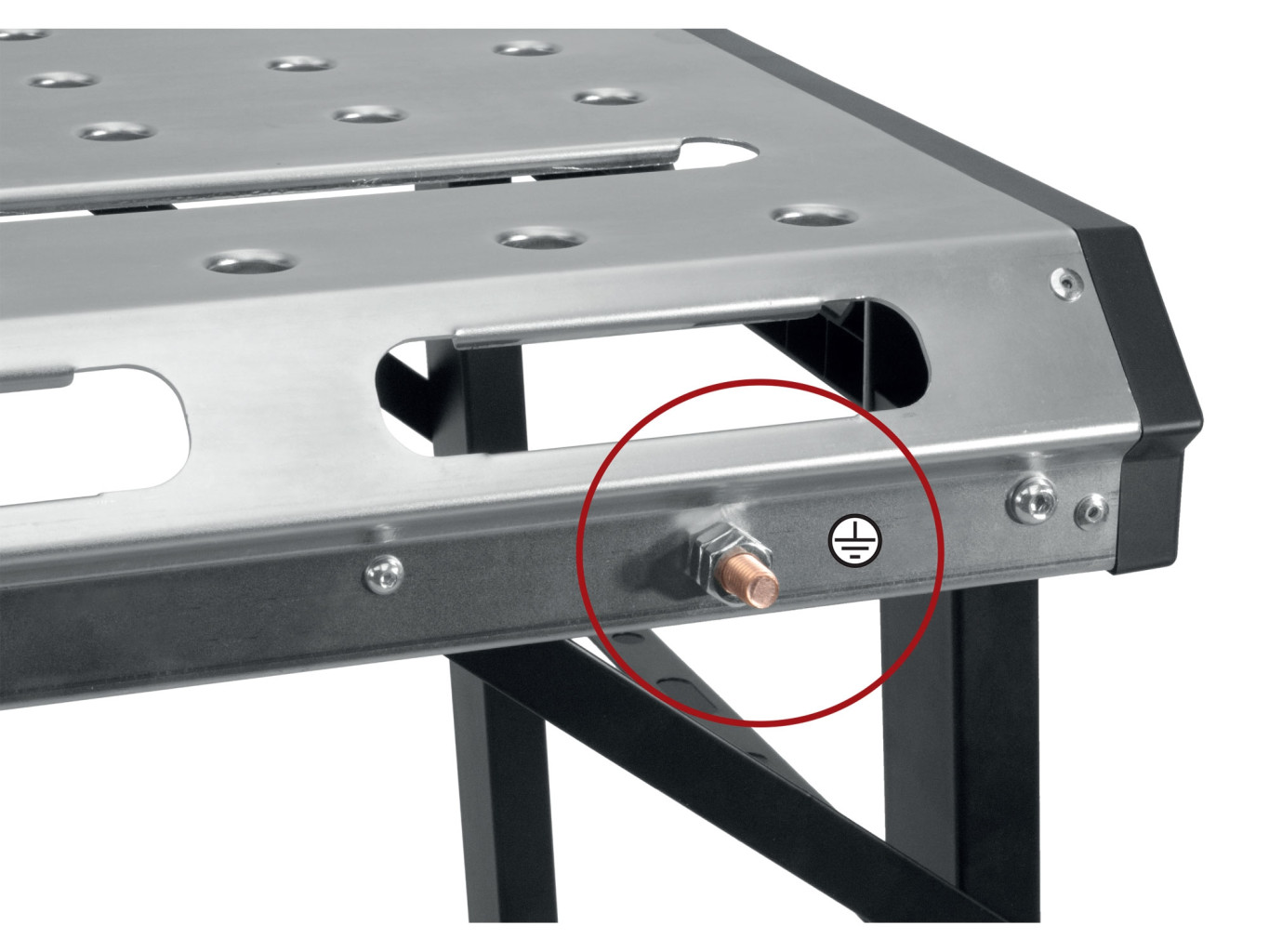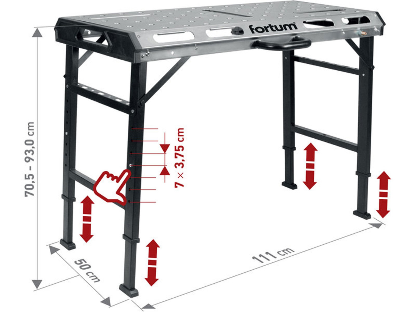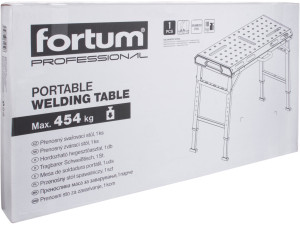Dotaz na produkt Na splátky ještě dnesPřenosný svařovací stůl FORTUM s výškovým nastavením pracovní plochy o rozměrech 107x53cm vyrobené z galvanizovaného ocelového 2mm tlustého plechu s množstvím manipulačních výřezů a otvory o průměru 20mm pro vymezovací/opěrné zarážky nebo upínací svěrky Max. nosnost stolu je 454kg .