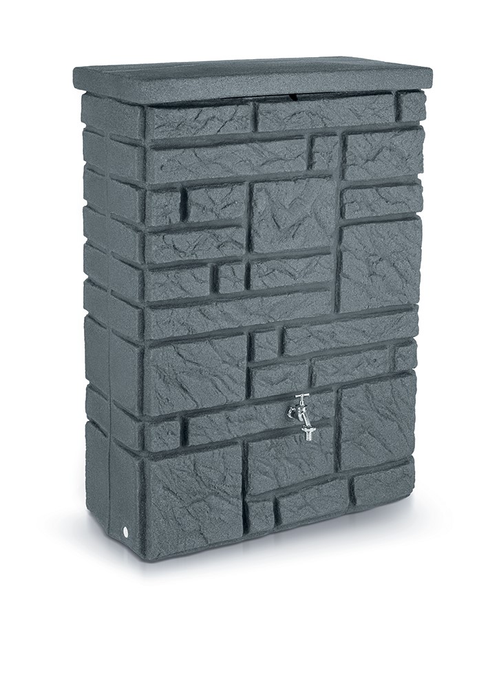 Sud na dešťovou vodu s objemem 300 l. Design reálné kamenné zdi. Možnost přidání kohoutku nebo spojky pro zahradní hadici. Horní otvor s víkem. Rozměry (š x v x h): 40 x 118 x 80 cm
