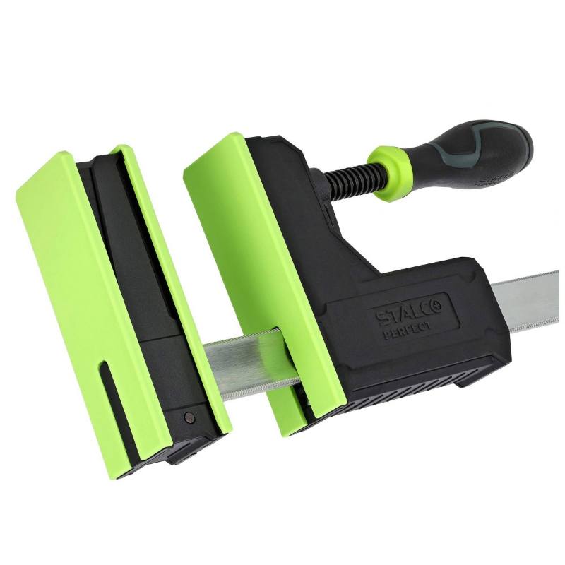 truhlářská svěrka z řady STALCO PERFECTpro rychlé a přesné upevňování rámečků, dveří a dalších prvkůčelisti se speciálním 3,5 palce širokým obložením pro rovnoměrným tlakem bez poškození lisovaného...