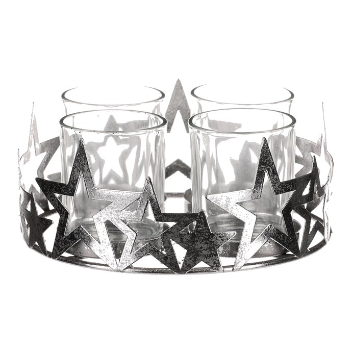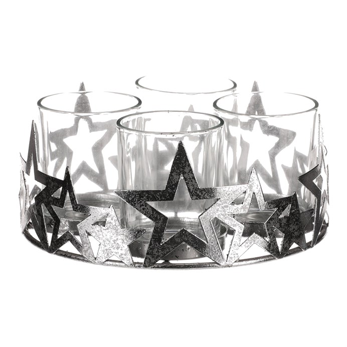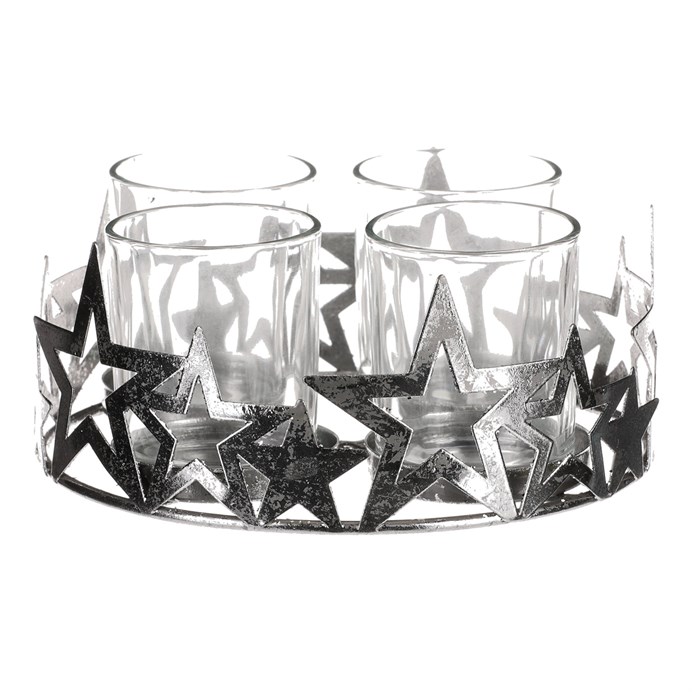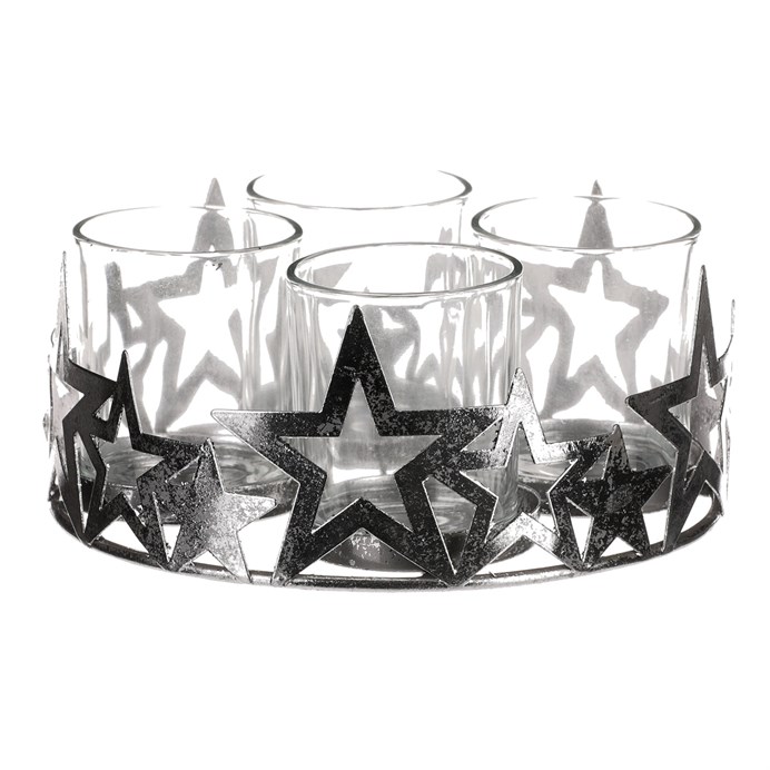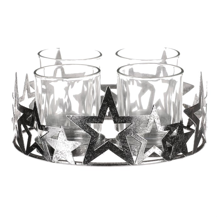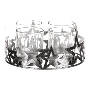 Dotaz na produktTento kovový svícen ve stříbrné barvě je dobrým základem pro tvorbu vlastní kreativní vánoční a zejména adventní výzdoby. Obsahuje celkem čtyři držáky se skleněnými kalíšky pro vložení svíček a zbytek tvoří ozdobná konstrukce s hvězdičkami. Svojí univerzálností a všestranností nabízí nepřeberné množství využití a je jen na vaší fantazii a dekoračních schopnostech, jak jej případně dozdobit a kam jej nejlépe umístit.