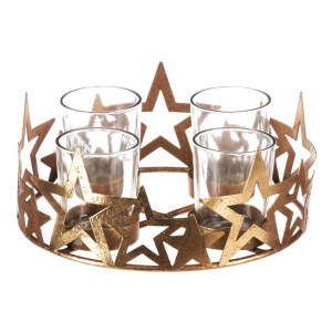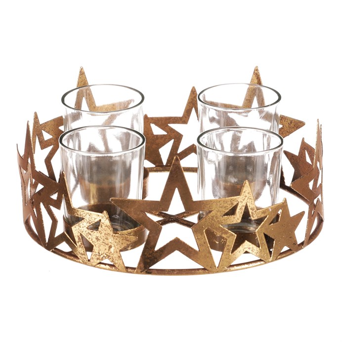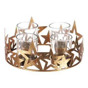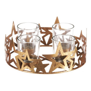 Dotaz na produktTento kovový svícen ve zlaté barvě je dobrým základem pro tvorbu vlastní kreativní vánoční a zejména adventní výzdoby. Obsahuje celkem čtyři držáky se skleněnými kalíšky pro vložení svíček a zbytek tvoří ozdobná konstrukce s hvězdičkami. Svojí univerzálností a všestranností nabízí nepřeberné množství využití a je jen na vaší fantazii a dekoračních schopnostech, jak jej případně dozdobit a kam jej nejlépe umístit.