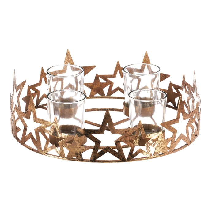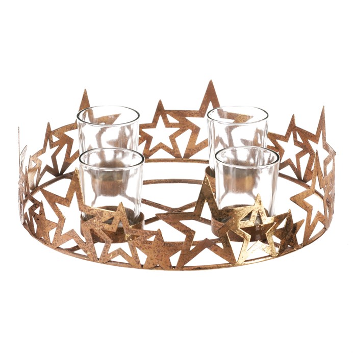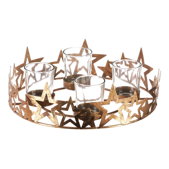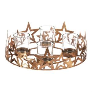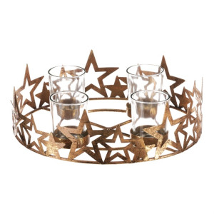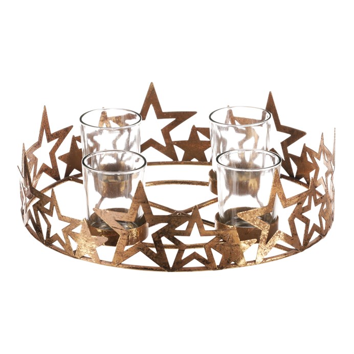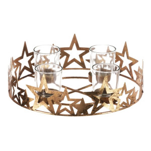 Dotaz na produktTento kovový svícen ve zlaté barvě je dobrým základem pro tvorbu vlastní kreativní vánoční a zejména adventní výzdoby. Obsahuje celkem čtyři držáky se skleněnými kalíšky pro vložení svíček a zbytek tvoří ozdobná konstrukce s hvězdičkami. Svojí univerzálností a všestranností nabízí nepřeberné množství využití a je jen na vaší fantazii a dekoračních schopnostech, jak jej případně dozdobit a kam jej nejlépe umístit.