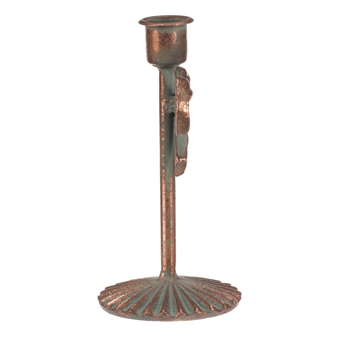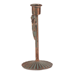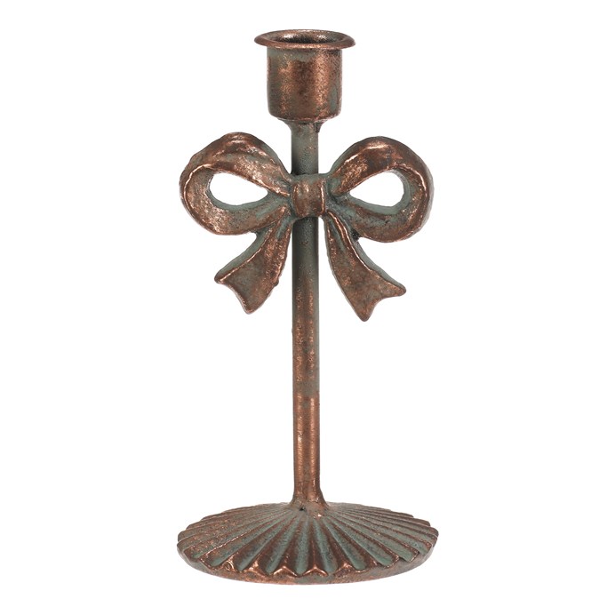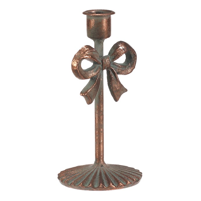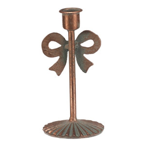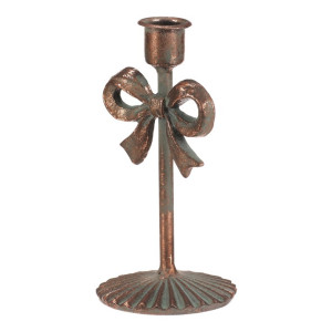 Dotaz na produktKovový svícen v měděném odstínu zaujme svým dekorativním provedením s výraznou mašlí uprostřed. Je určen pro kónické svíčky a díky pevné základně poskytuje stabilní oporu. Jeho výška 16 cm umožňuje snadné umístění na stůl, komodu nebo poličku, kde vytvoří příjemnou atmosféru. Povrchová úprava s patinou dodává svícnu rustikální charakter a vizuální efekt starožitnosti.