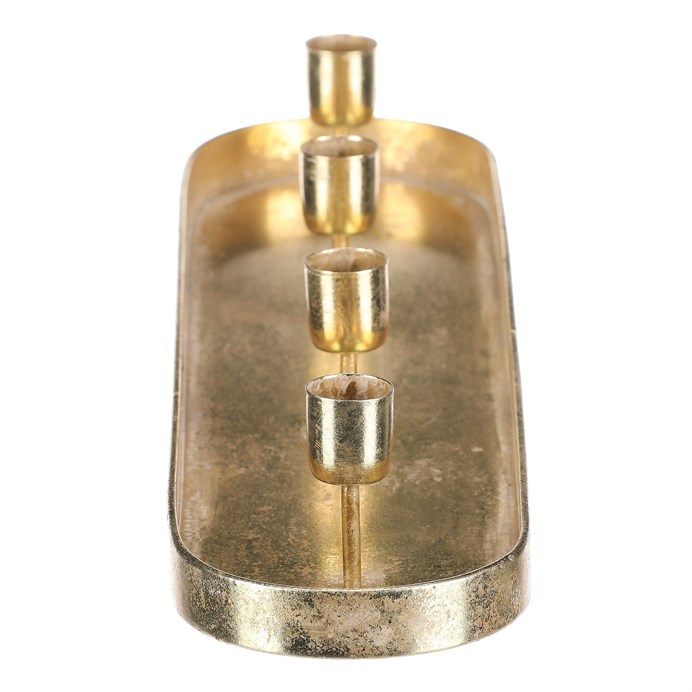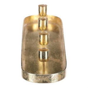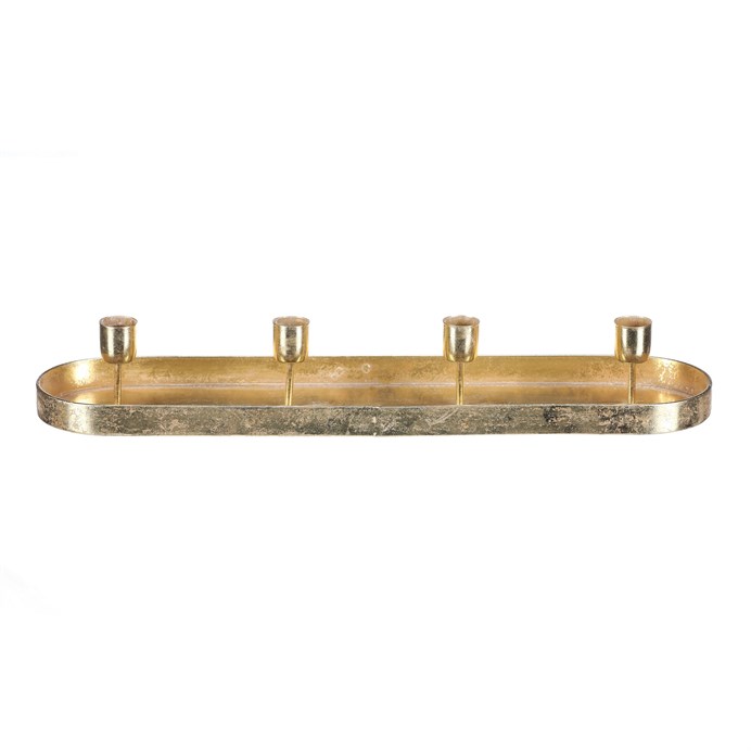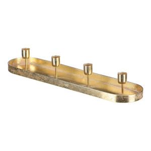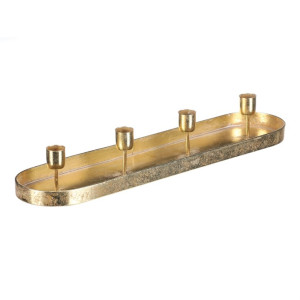 Dotaz na produkt Na splátky ještě dnesKovový zlatý svícen na čtyři kónické svíčky, v podobě elegantního oválného tácu, je ideálním doplňkem pro váš adventní stůl. Jeho prostý, a přesto vkusný design, dodá vaší sváteční výzdobě ten správný nádech elegance. Tento svícen je skvělým centrálním prvkem na vašem stole a zároveň vkusnou dekorací, která podtrhne vánoční magii a přinese do domova útulnou a slavnostní náladu.