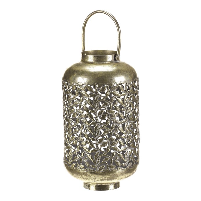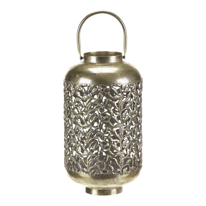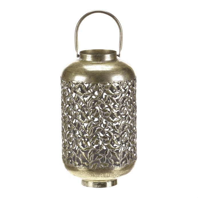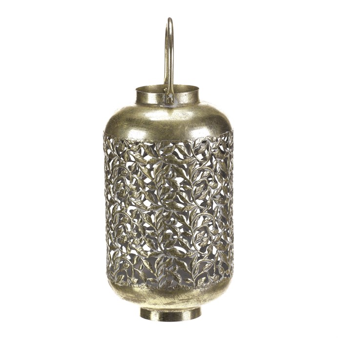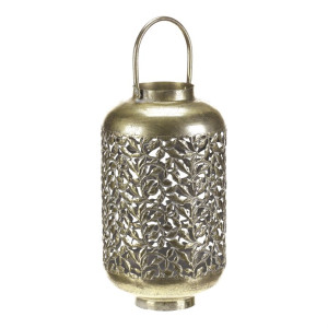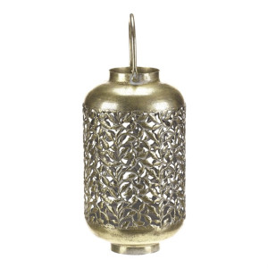 Dotaz na produkt Na splátky ještě dnesKovový svícen ve zlatém odstínu zaujme propracovaným rostlinným dekorem, který vytváří zajímavý světelný efekt při zapálení svíčky. Jeho otevřený design umožňuje optimální proudění vzduchu a bezpečné používání. Praktické madlo usnadňuje přenášení nebo zavěšení svícnu v interiéru i exteriéru. Vynikne jako dekorativní prvek na stole, poličce nebo terase a přispívá k příjemné atmosféře.