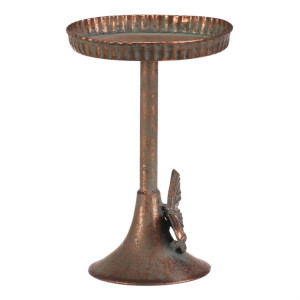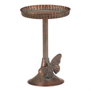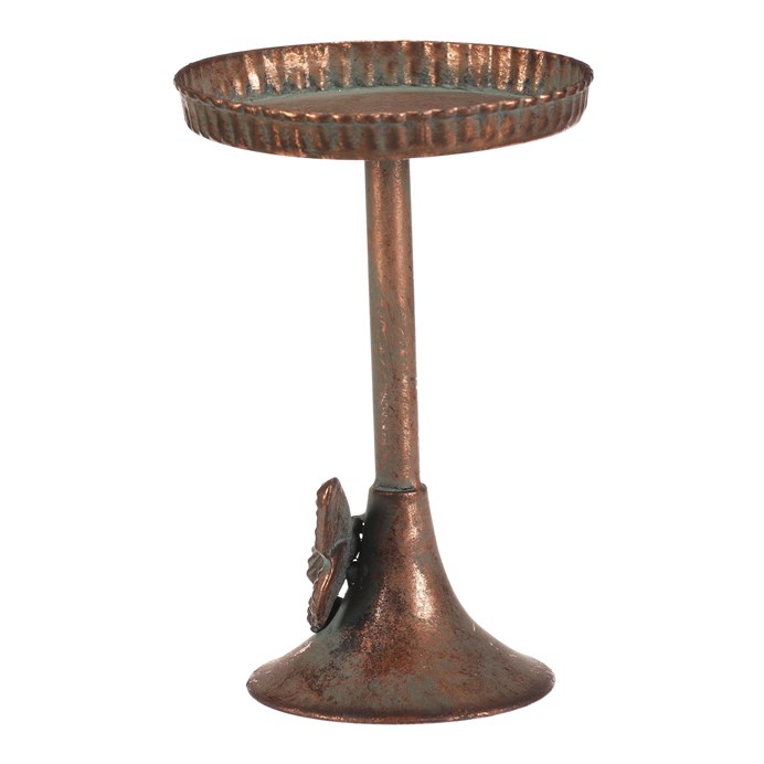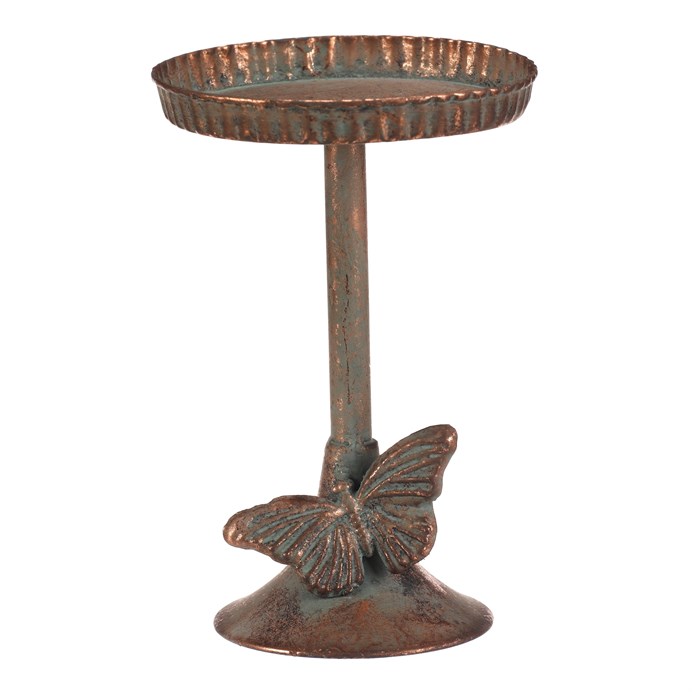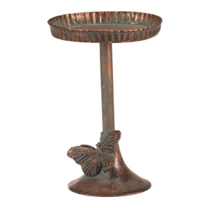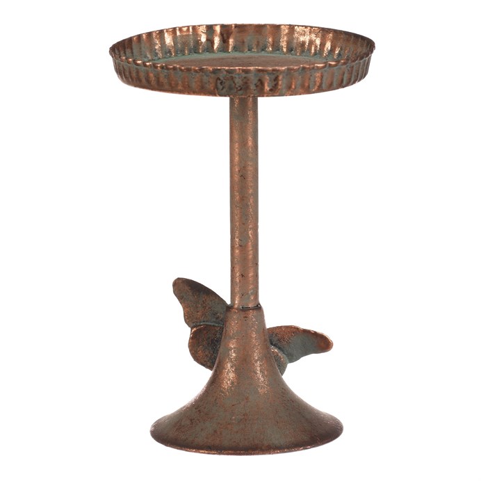 Dotaz na produktKovový svícen v měděném odstínu zaujme svým rustikálním vzhledem a detailním zpracováním motýla na základně. Kulatá miska s vroubkovaným okrajem je vhodná pro umístění svíčky nebo drobných dekorací. Díky pevné kovové konstrukci je stabilní a snadno se udržuje. Svícen střední velikosti se hodí na stůl, komodu nebo parapet a přidá interiéru hřejivý kovový akcent.