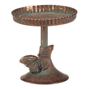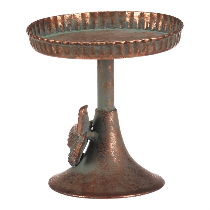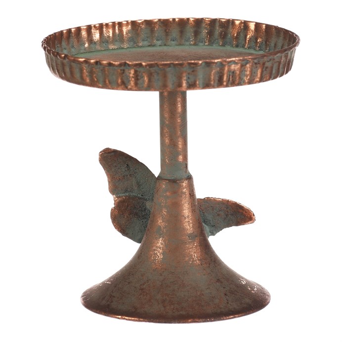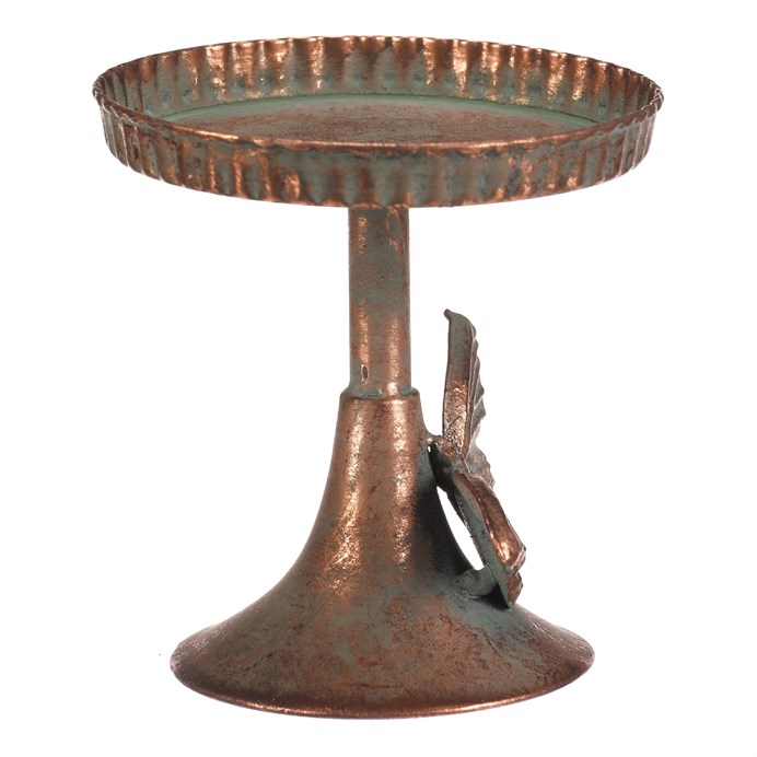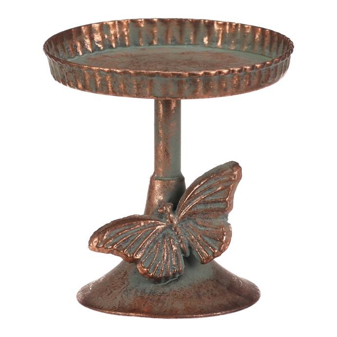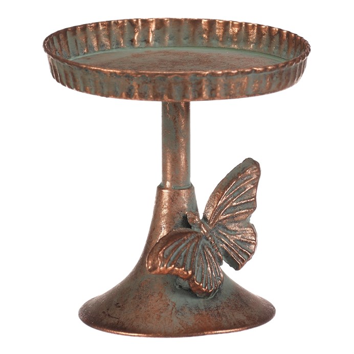 Dotaz na produktKovový svícen v měděném odstínu zaujme svým rustikálním vzhledem a detailním zpracováním motýla na základně. Kulatá miska s vroubkovaným okrajem je vhodná pro umístění menších svíček či dekorací. Kompaktní velikost S umožňuje snadné umístění na stůl, komodu nebo poličku, kde podtrhne atmosféru prostoru. Povrchová úprava s patinou dodává svícnu autentický vintage efekt.