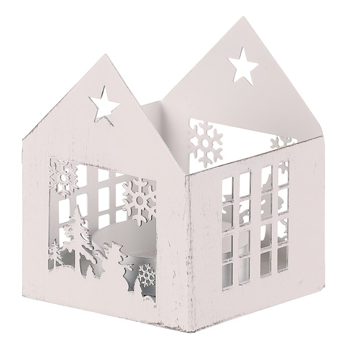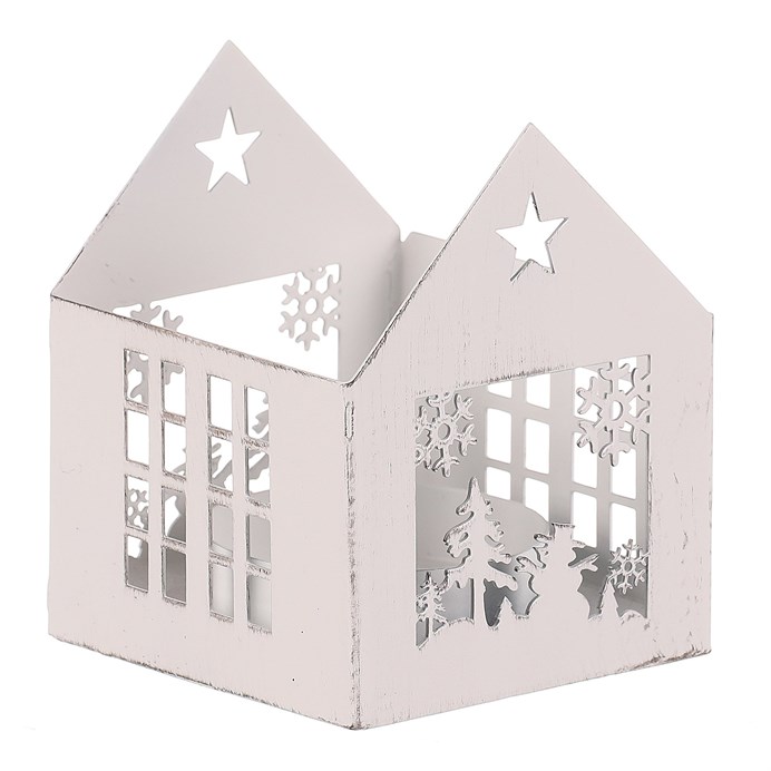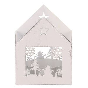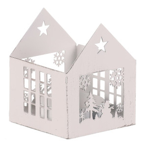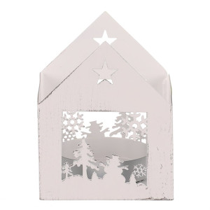 Dotaz na produktMalý kovový svícen ve tvaru domečku v bílém dekoru, dodá interiéru nádech elegance a možnost vyvolat kouzelný světelný efekt. Tento svícen nejenže přináší světlo a zářivou atmosféru, ale také představuje půvabný dekorační prvek pro váš domov. Umístěte do něj svíčku a sledujte, jak se zářivé světlo line prostorem. Ideální volba pro vánoční výzdobu, která okouzlí každého, kdo váš domov navštíví.