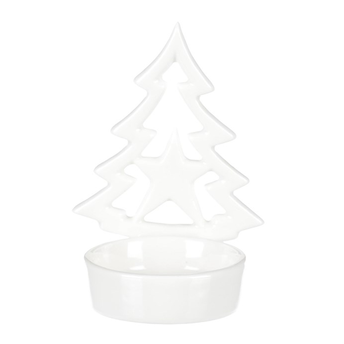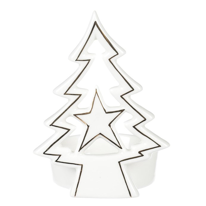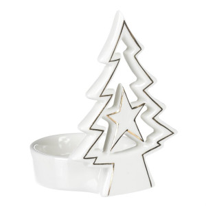 Dotaz na produktBílý porcelánový svícen v podobě stromku s hvězdou a miskou na vložení čajové svíčky bude skvělým doplňkem vánoční či adventní výzdoby. Získáte tím elegantní ozdobu s možností vytvoření neodolatelného světelného efektu, díky plápolajícímu plaménku. Svým univerzálním provedením se hodí do každého prostoru a nabízí nespočet možností umístění a aranžování s dalšími dekoracemi.