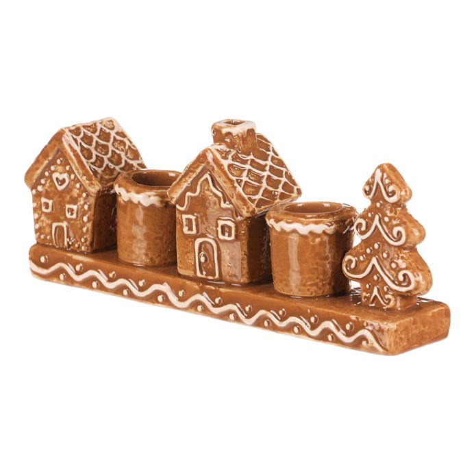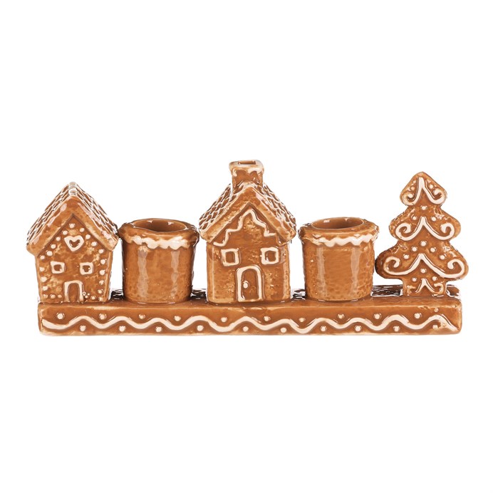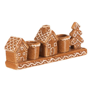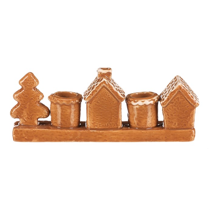 Dotaz na produktKrásný keramický svícen v perníkovém designu s bílou polevou, bude perfektní ozdobou pro čas Vánoc. Obsahuje celkem 2 kalíšky na vložení kónických svíček. Zbytek svícnu zdobí dva domky a jeden stromeček.