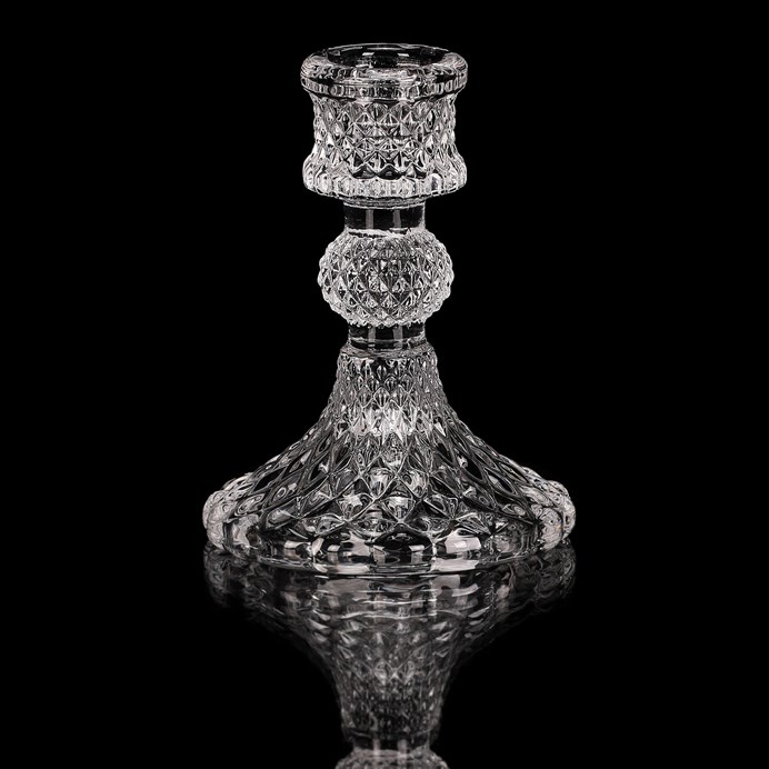 Dotaz na produktSkleněný svícen na kónickou svíčku s výškou 11 cm z čirého broušeného skla. Jeho elegantní design vynikne v každém interiéru, a díky své hmotnosti bude stabilní a bezpečný pro ozdobení stolů a poliček. Jedná se o působivou dekoraci, která po zapálení svíčky rozzáří prostor neodolatelnými třpytivými odlesky všemi směry.