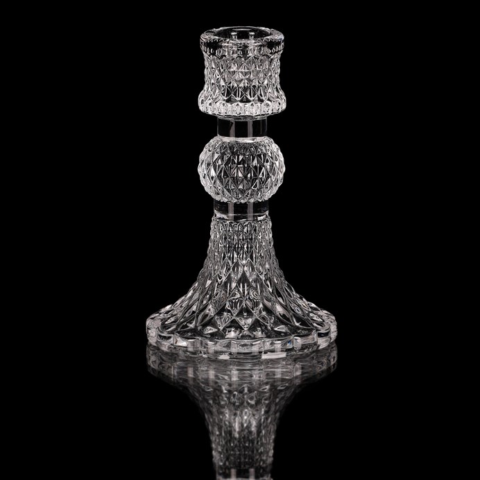 Dotaz na produktSkleněný svícen o výšce 13 cm je určený pro kónické svíčky a vyniká čistým čirým provedením s výrazným broušeným vzorem, který dodává dekorativní efekt a zajímavou hru světla. Tělo svícnu je robustní a stabilní, což zajišťuje bezpečné umístění svíčky. Díky kvalitnímu sklu se snadno udržuje a je vhodný pro různé interiérové styly, kde podtrhne atmosféru klidu a elegance.