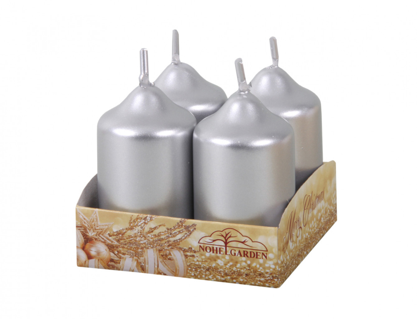 Dotaz na produktStříbrná lesklá adventní svíčka ve tvaru válce. V balení jsou 4 kusy. Velikost svíčky: d4 x 7 cm.