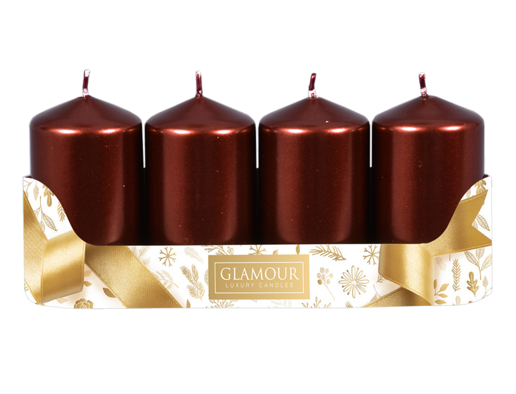 Dotaz na produktSada adventních svíček. Mají tvar válce a povrch mají hladký, v úpravě metalický lesk. Jsou jednoduché a zároveň velmi efektní. Doba hoření: 30 hodin. Rozměr: průměr 5 cm, výška 9 cm. Balení obsahuje 4 ks svíček. Barva: bordó.