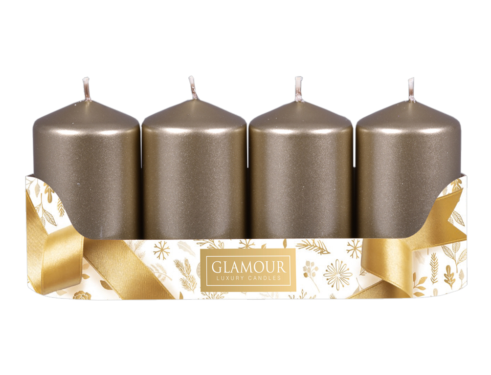 Dotaz na produktSada adventních svíček. Mají tvar válce a povrch mají hladký, v úpravě metalický lesk. Jsou jednoduché a zároveň velmi efektní. Doba hoření: 30 hodin. Rozměr: průměr 5 cm, výška 9 cm. Balení obsahuje 4 ks svíček. Barva: zlato-stříbrná.