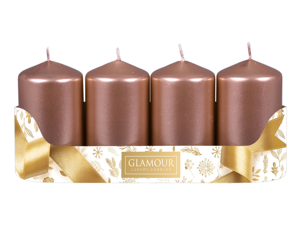 Dotaz na produktSada adventních svíček. Mají tvar válce a povrch mají hladký, v úpravě metalický lesk. Jsou jednoduché a zároveň velmi efektní. Doba hoření: 30 hodin. Rozměr: průměr 5 cm, výška 9 cm. Balení obsahuje 4 ks svíček. Barva: růžovo-zlatá.