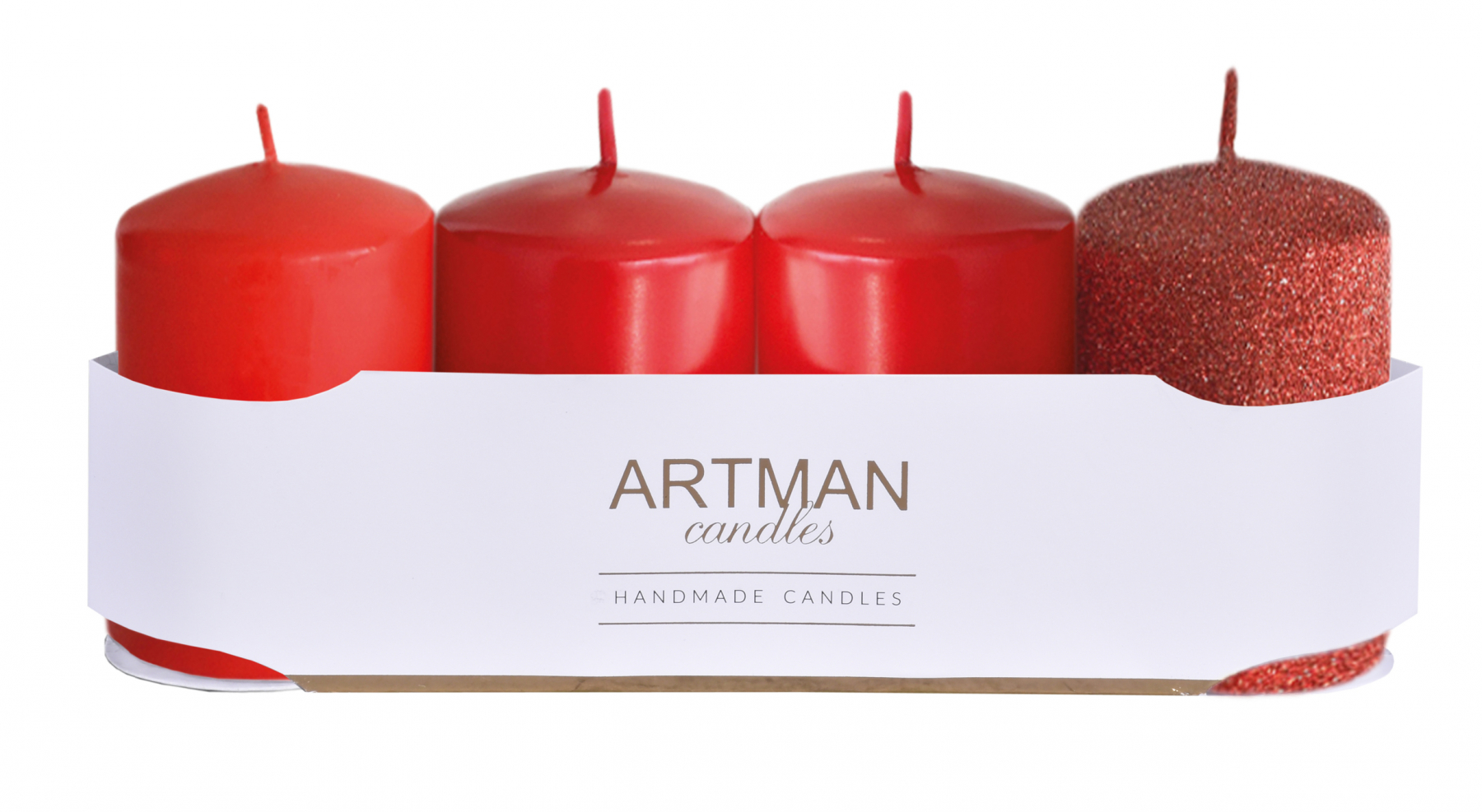 Dotaz na produktSet adventních svíček z nichž každá má jiný povrch (matný, lakovaný, metalický a brokátový). Ozvláštní adventní věnec, ale i jakoukoliv dekoraci ze svíček. V atraktivních barvách. Rozměry: průměr 6 cm, výška 9 cm. V balení jsou 4 svíčky. Doba hoření: 4 x 48 hod. Barva: odstíny červené.