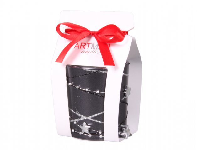 Vonná svíčka ve skle ozdobeném glitrovými proužky a hvězdičkami. Sklo je umístěno v dárkové papírové krabičce s mašličkou. Hmotnost náplně: 130 g. Výška: 8,3 cm, šířka: 7,4 cm.