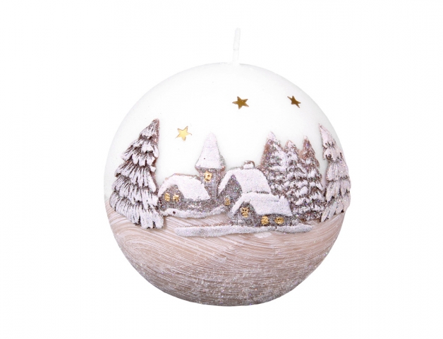Dotaz na produktVánoční svíčka ve tvaru koule je ozdobena zasněženou vesničkou a lesem. Při zapálení knotu se aktivují LED diody, které vyvolají střídání barev. Délka hoření: 40 hodin. Průměr: 10 cm.
