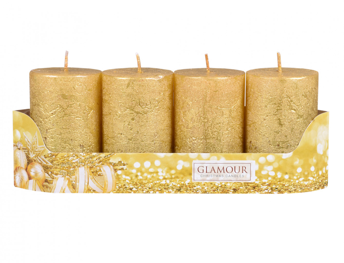 Dotaz na produktRustikální adventní svíčky ve tvaru válce. Svíčky mají metalický povrch. Budou se vyjímat v moderním, dobovém i rustikálním interiéru. V balení jsou 4 kusy. Doba hoření: 21 hodin. Velikost svíčky: průměr 5cm, výška 8cm. Barva: zlatá.