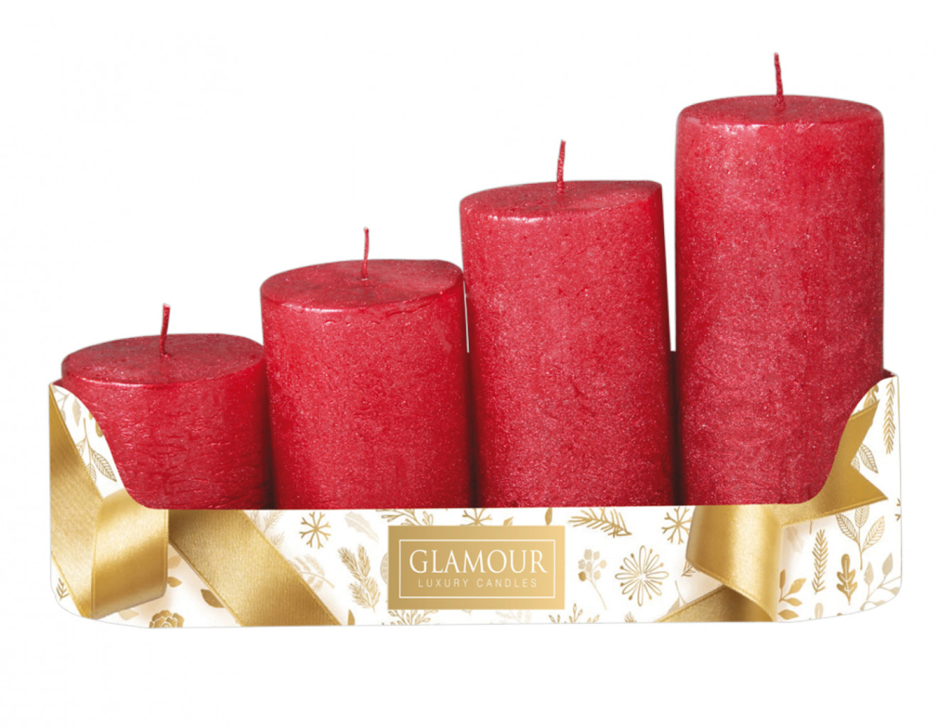 Dotaz na produktAdventní svíčky s rustikálním metalickým povrchem. Svíčky jsou stupňovité: průměr: 5 cm, výšky: 6 cm, 8 cm, 10 cm, 12 cm. Barva: červená.