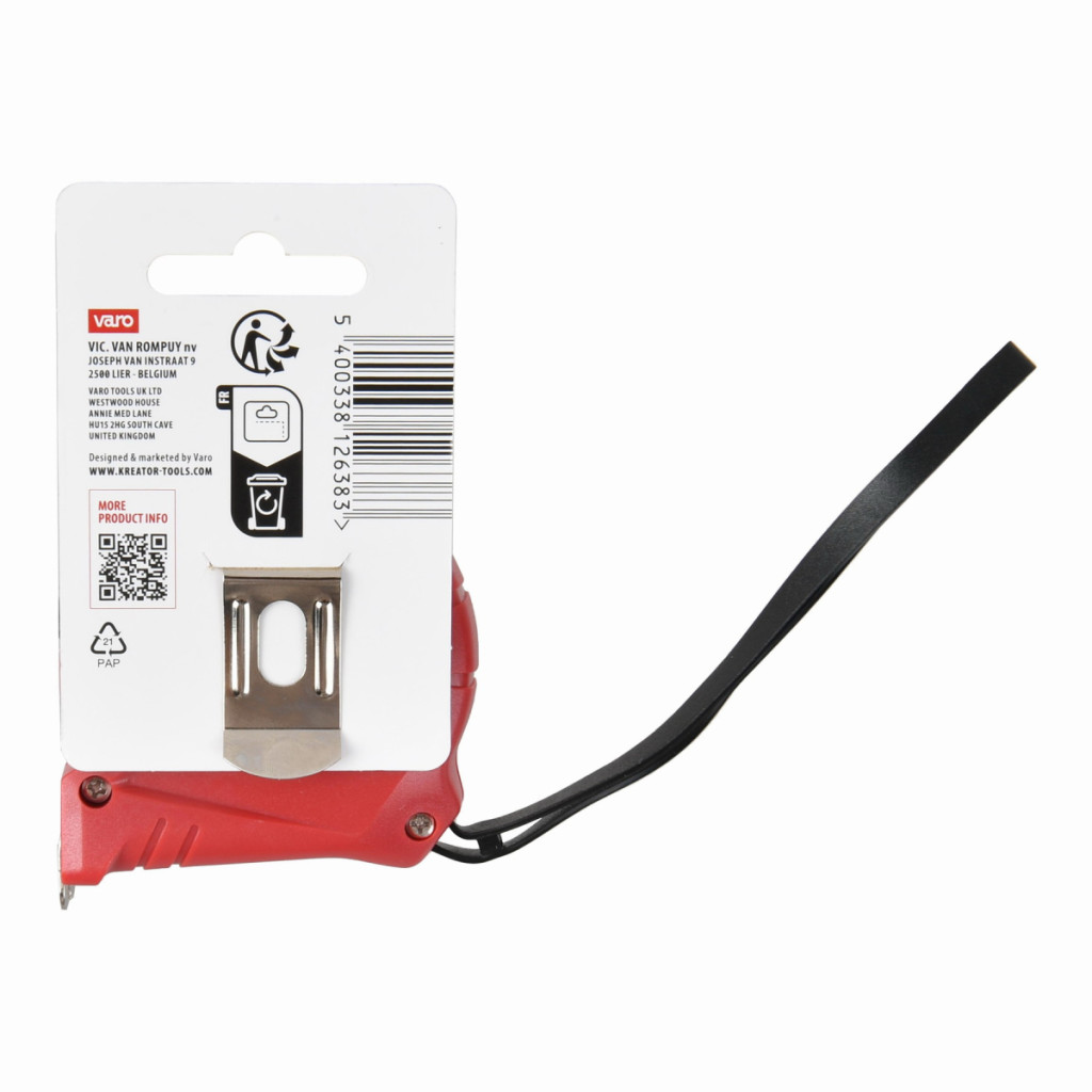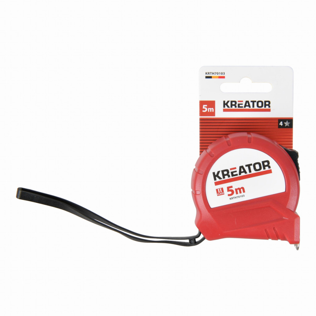 Dotaz na produktTento svinovací metr KRTH70103 z naší řady Kreator má maximální délku 5 m. Zajistěte jej pomocí zajišťovacího tlačítka, aby se během používání nenavíjel. Pokud potřebujete mít volné ruce, můžete si metr snadno připevnit na opasek díky klipu na opasek.