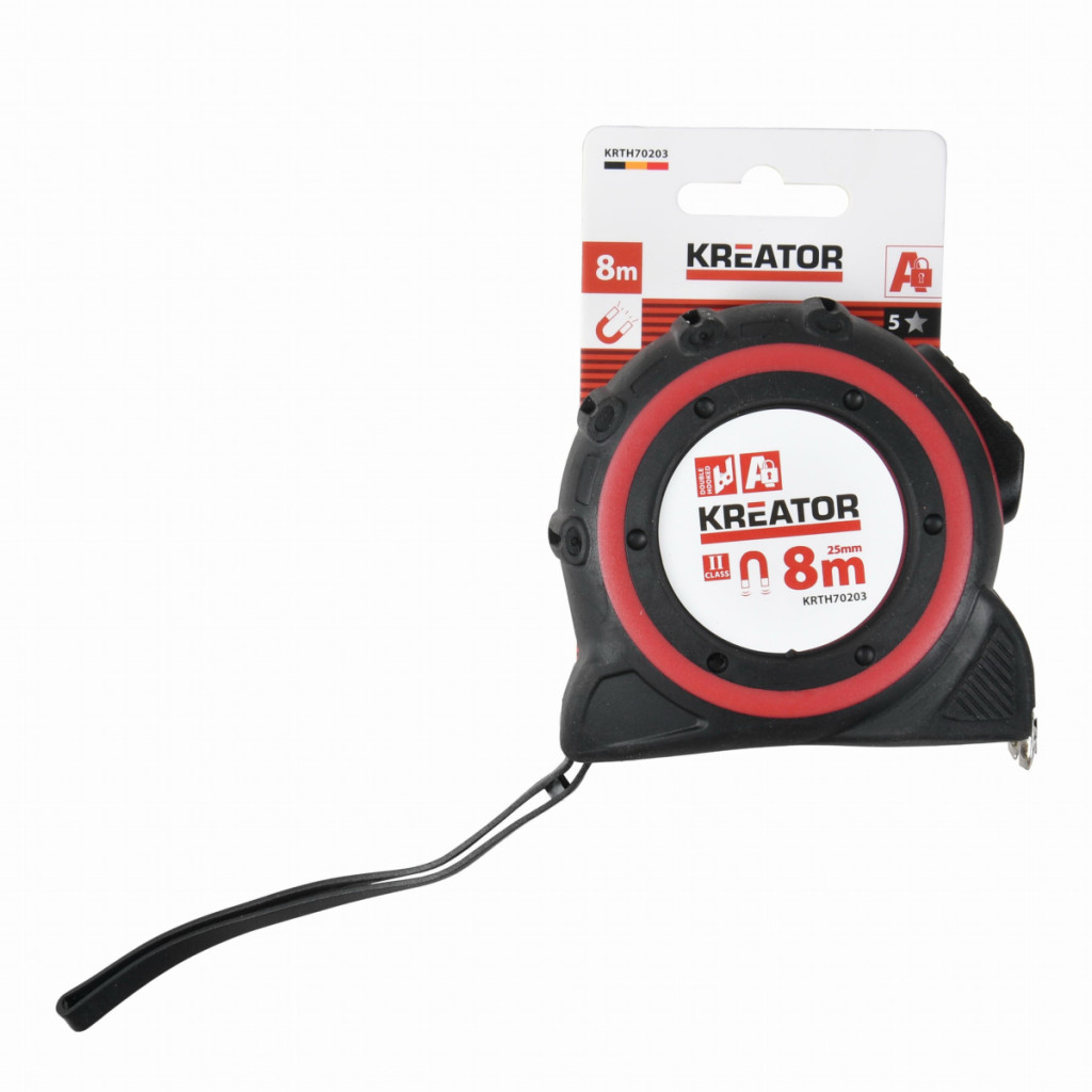 Dotaz na produktTento svinovací metr KRTH70203 z naší řady Kreator s magnetickou špičkou má maximální délku 8 m. Zajistěte jej pomocí zajišťovacího tlačítka, aby se během používání nenavíjel. Pokud potřebujete mít volné ruce, můžete si metr snadno připevnit na opasek díky klipu na opasek. Měkký materiál rukojeti s měkkou rukojetí poskytuje větší úchop a pohodlí při používání. . Metr splňuje kategorii MID Class Quality 2.