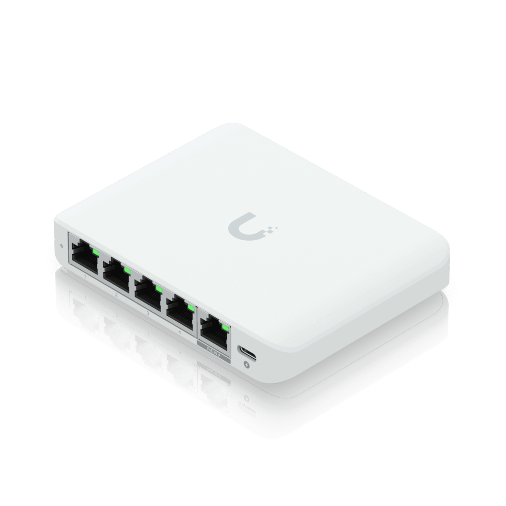 U switche máte na výběr ze 2 možností napájení. Buď použijete přiložený USB-C adaptér nebo zařízení napájíte přes síťový kabel připojený k PoE vstupu. Switch spravujete prostřednictvím aplikace UniFi Network. Zjednodušíte si nastavení a získáte přehled nad sítí.