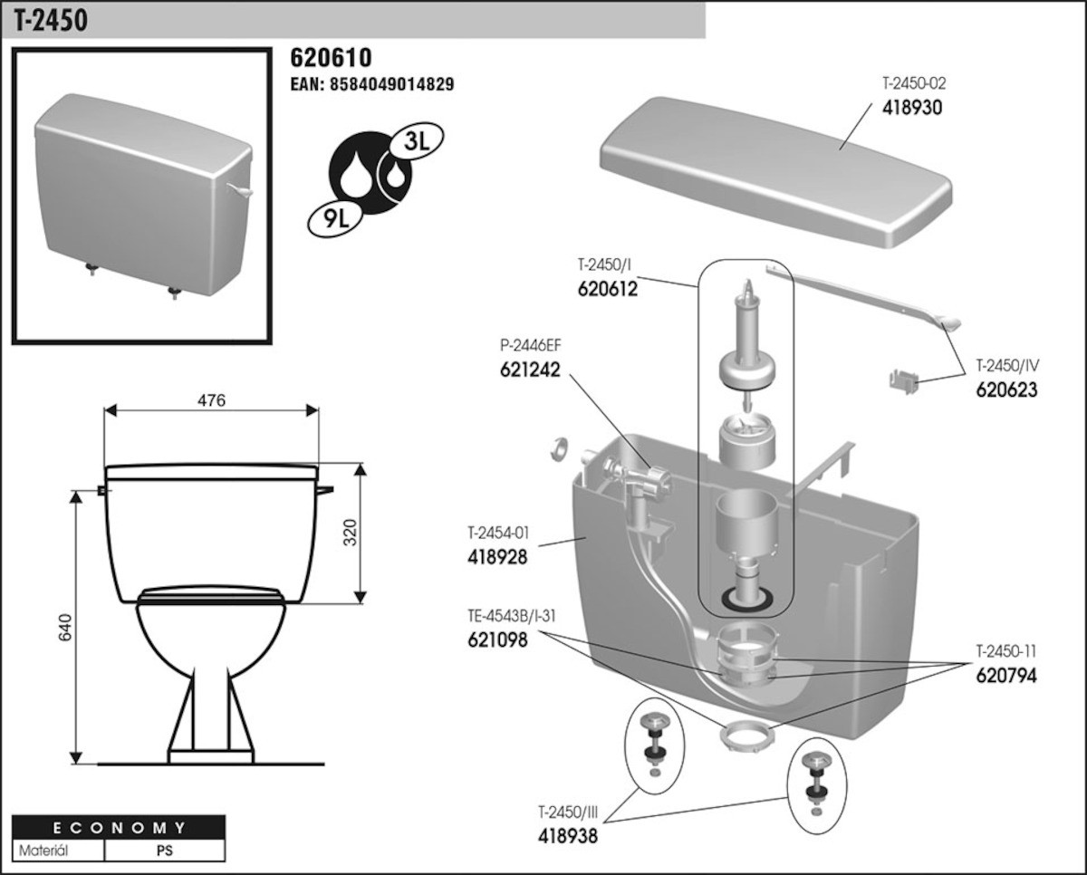Dotaz na produkt Na splátky ještě dnesPlastová nádržka je opatřená izolační vložkou proti orosování, víka, plnicího zařízení, kterým je plovákový ventil T-2443, úsporného vypouštěcího zařízení T- 2450/I s připojovacím závitem G 1/2“, ovládacího zařízení T-2433/IV. T-2450 je určen pro wc kombi, k záchodové míse je nádržkový splachovač upevňován spojovacími šrouby T-2431/III, které jsou součástí výrobku. Přívod vody i ovládaní je možné nainstalovat na pravou nebo levou stranu výrobku. Předností nádržky T-2450 je úsporné splachování. Při stlačení ovladače do první polohy vytečou z nádržky max.3 l vody, při stlačení ovladače do druhé polohy /ovladač nadoraz/, vyteče celý obsah nádržky. Výška hladiny vody v nádržce se dá regulovat nastavením plováku na plovákovem ventilu.