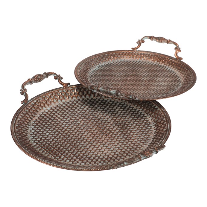 Dotaz na produktSada dvou aranžovacích táců v měděném provedení z kovu nabízí praktické a dekorativní řešení pro servírování či vystavení drobných předmětů. Povrch táců zdobí reliéfní vzor připomínající včelí plástve, který dodává celku zajímavý vizuální efekt. Každý tác je opatřen dvěma zdobenými úchyty pro snadnou manipulaci a přenášení. Vyniknou samostatně i jako součást stolní dekorace v rustikálním či vintage stylu interiéru.