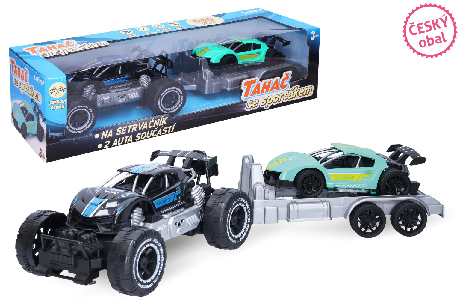 Dotaz na produktTahač s autem. Rozměry 45x12,5x9,5 cm. Obě auta na setrvačník. Jen barevná varianta - větší auto černé, menší zelené.
