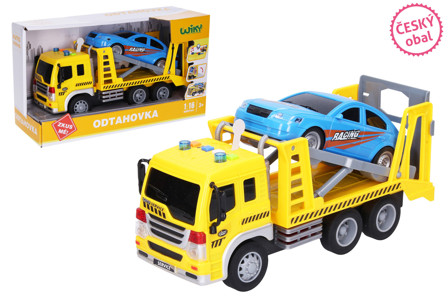 Dotaz na produktTahač s autem. Rozměry tahače 26x10x14 cm. Na setrvačník. Světelné a zvukové efekty tlačítky na kabině tahače. 3xAG13 baterie součástí.