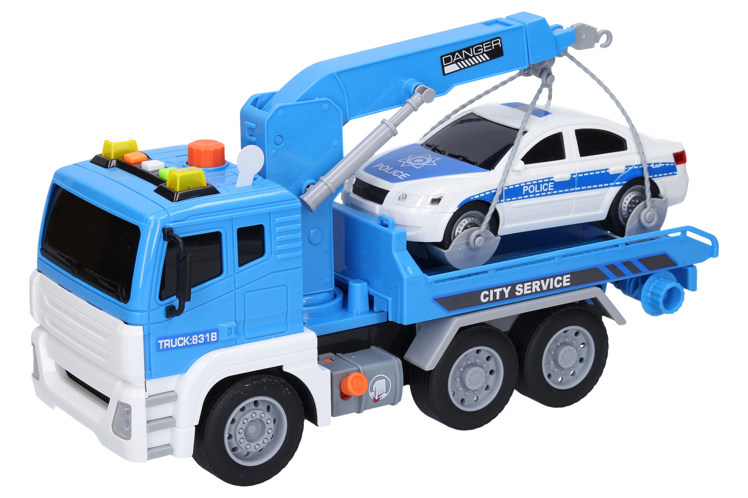 Dotaz na produktTahač s autem a efekty. Rozměry 30x13x17 cm. Na setrvačník. Světelné a zvukové efekty tlačítky na kabině tahače. 3xAG13 baterie součástí. Velké oranžové tlačítko na kabině - hydraulika nakládacího ramene - zvedání. Oranžová páčka mezi koly položení (uvolnění) nakládacího ramene.
