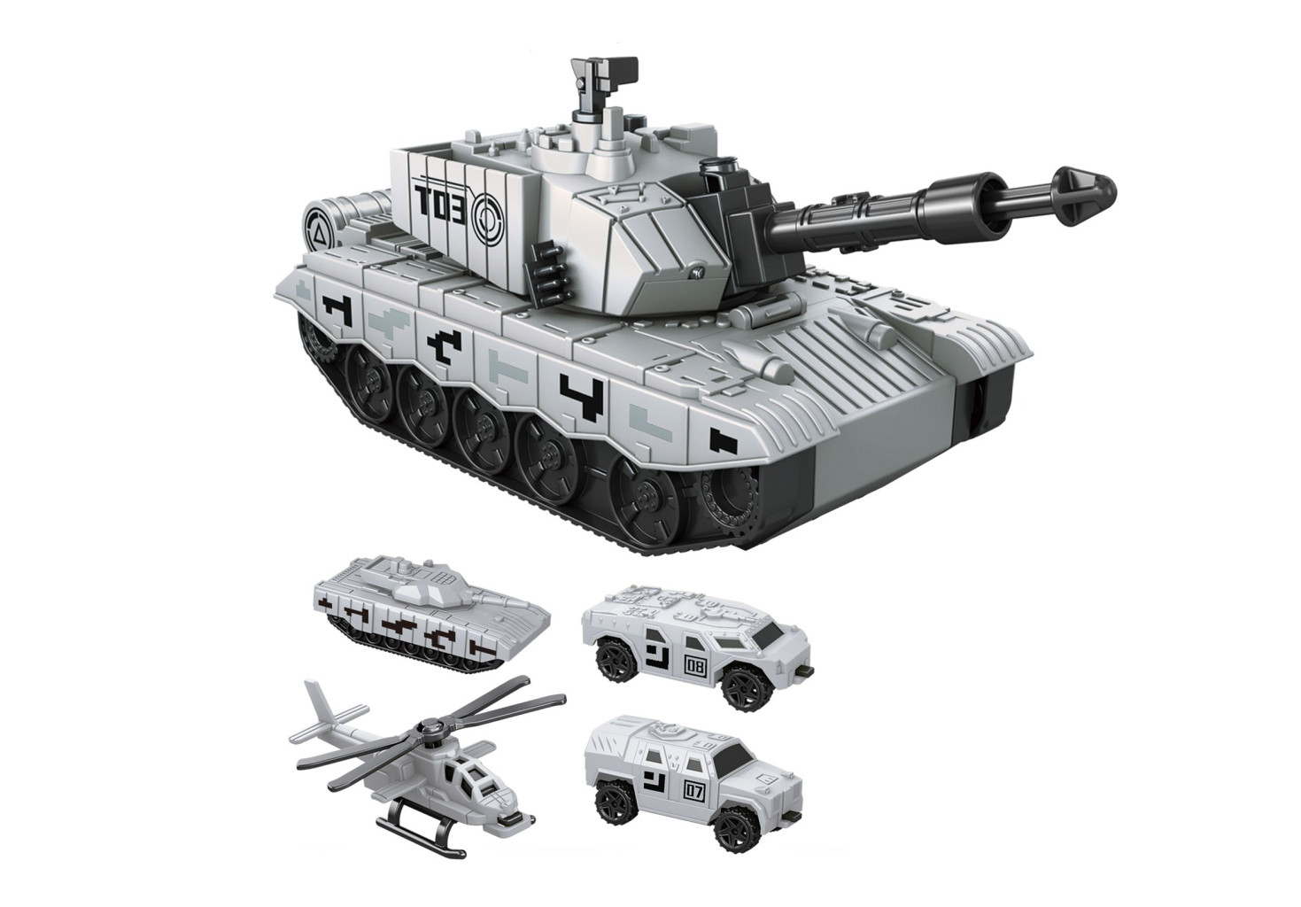 Dotaz na produktTank na setrvačník vystřelovací. Velikost 21 cm. Vystřelování šipek - šipku zasuňte do kanónu tanku, tlačítkem na kanónu vystřelíte. Vystřelovací garáž na auta v přední části tanku - odklopte dvířka, vložte autíčko, velkým tlačítkem v zadní části tanku vystřelíte. Obsah balení - tank 21 cm, 3x vojenské auto 7 cm volná kola, vrtulník 8 cm, 8 šipek do tanku. Obrázkový návod na obalu.