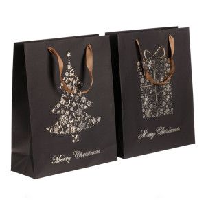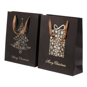 Dotaz na produktDárková papírová taška v elegantní černé barvě se zlatým vzorem je dostupná ve dvou variantách, buď s motivem vánočního stromku, nebo dárku. Díky svému stylovému vzhledu dodá vašim dárků luxusní nádech. Do tašky se dárek snadno vloží, což ušetří čas při balení. Navíc se dobře nosí a vypadá skvěle pod stromečkem.