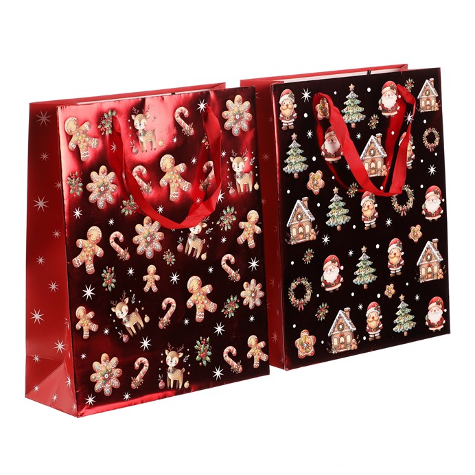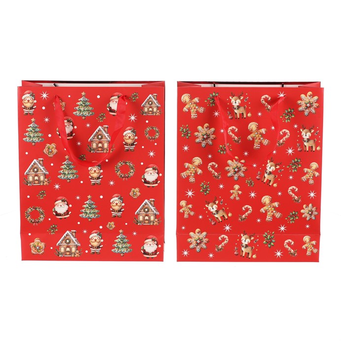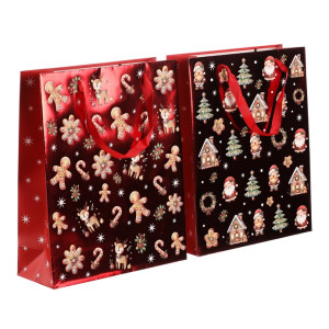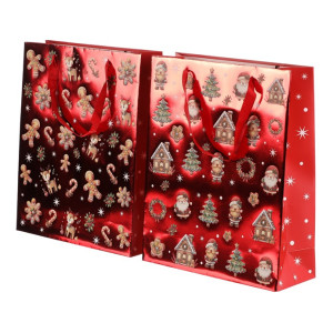 Dotaz na produktPapírová vánoční taška v červené barvě v mixu 2 druhů s motivy perníkových panáčků, stromků, chaloupek a dalších svátečních prvků. Ideální na rychlé a stylové balení dárků, přičemž stačí vložit a máte hotovo. Dobře se nosí, vypadá nádherně a ušetří vám spoustu času oproti balení do klasického dárkového papíru.