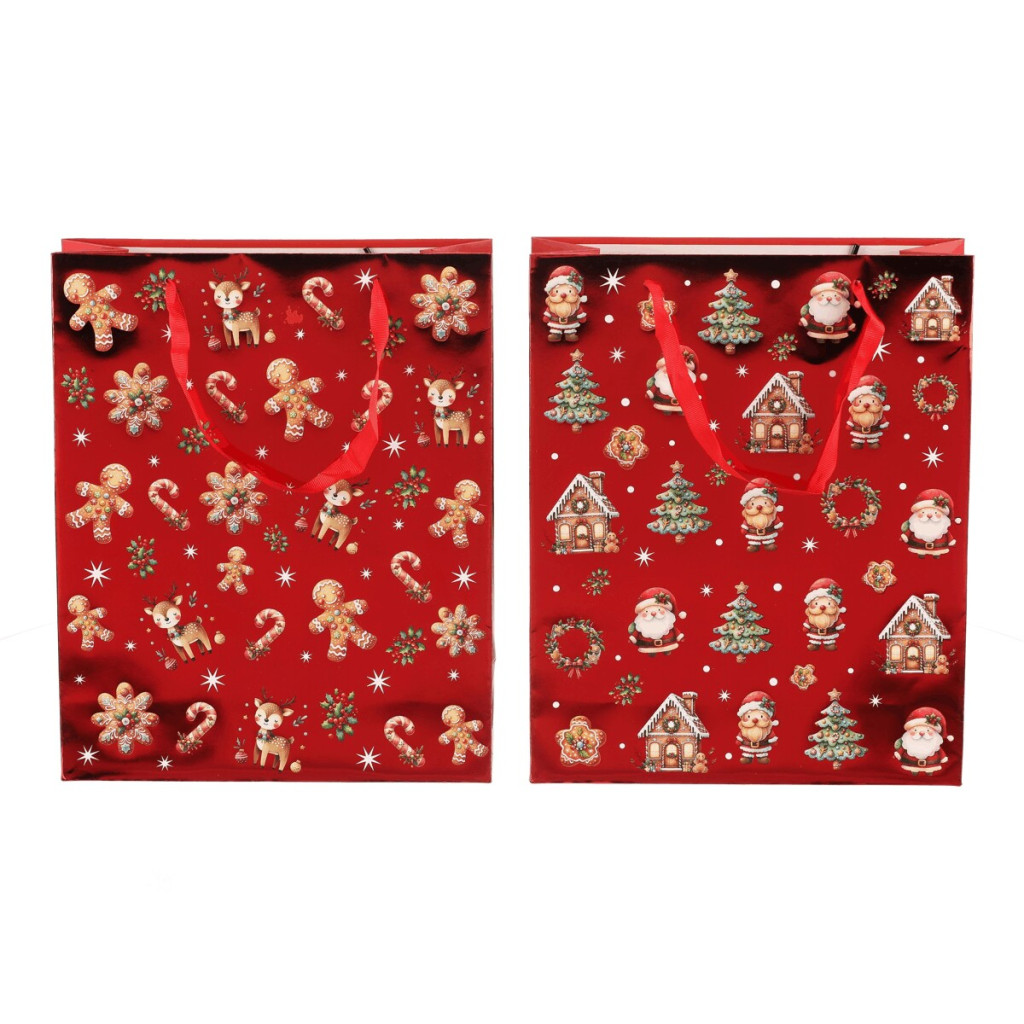 Dotaz na produktPapírová vánoční taška v červené barvě v mixu 2 druhů s motivy perníkových panáčků, stromků, chaloupek a dalších svátečních prvků. Ideální na rychlé a stylové balení dárků, přičemž stačí vložit a máte hotovo. Dobře se nosí, vypadá nádherně a ušetří vám spoustu času oproti balení do klasického dárkového papíru.