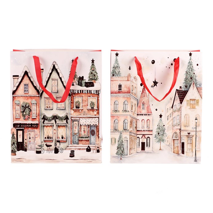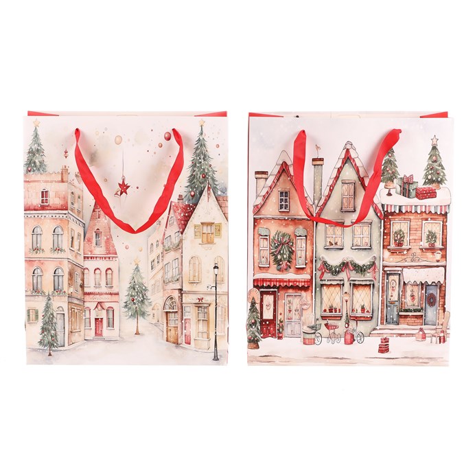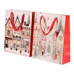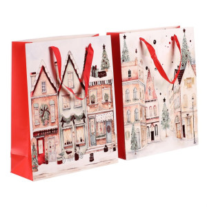 Dotaz na produktDárková papírová taška s kouzelným motivem vánočně vyzdobeného městečka, přičemž je na výběr mezi dvěma variantami. Umožňuje praktické a stylové balení dárků bez zbytečné práce, kdy stačí vložit a máte hotovo. Tašky jsou pevné, dobře se nosí a dodají dárečkům ten správný, sváteční nádech.