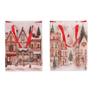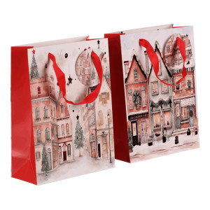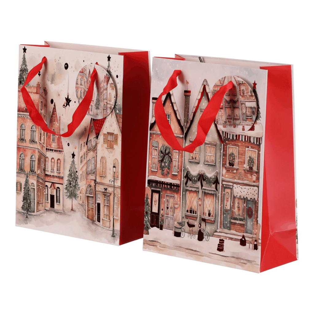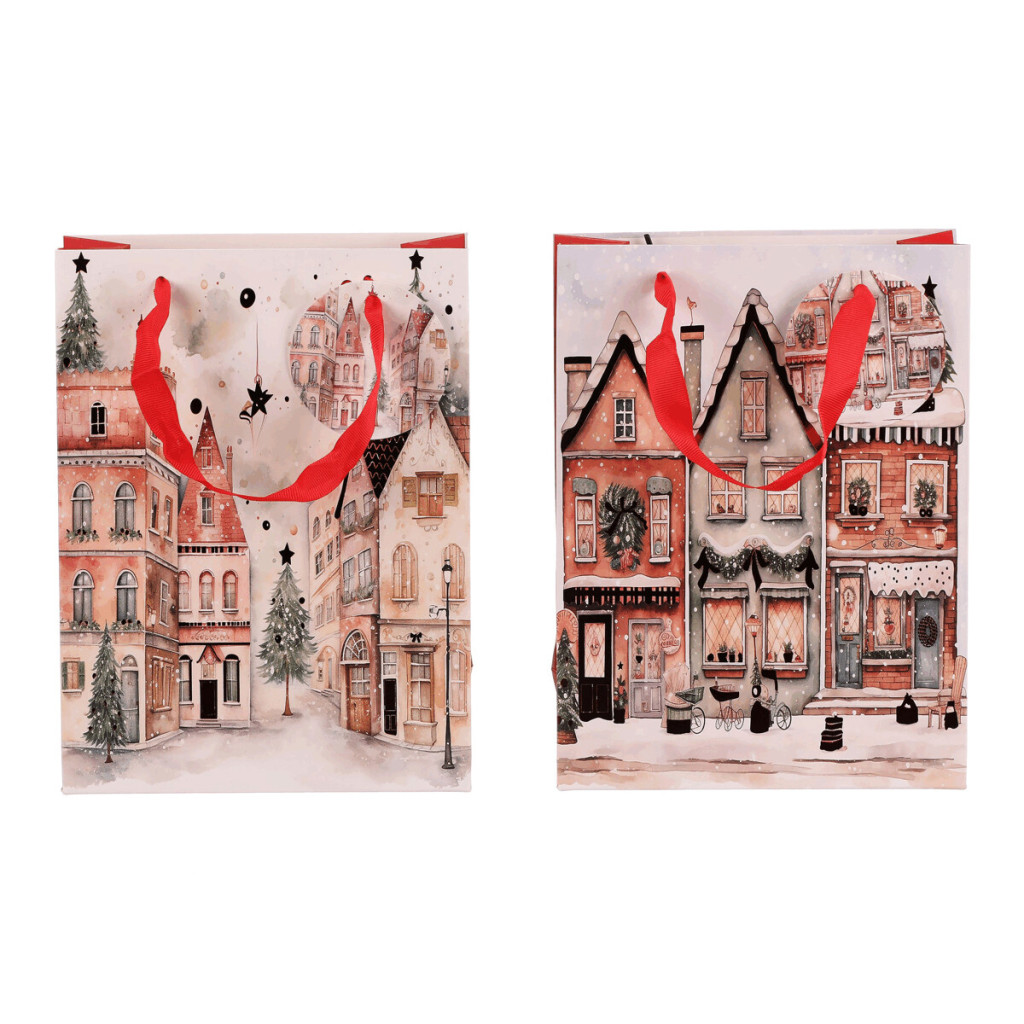 Dotaz na produktDárková papírová taška s kouzelným motivem vánočně vyzdobeného městečka, přičemž je na výběr mezi dvěma variantami. Umožňuje praktické a stylové balení dárků bez zbytečné práce, kdy stačí vložit a máte hotovo. Tašky jsou pevné, dobře se nosí a dodají dárečkům ten správný, sváteční nádech.