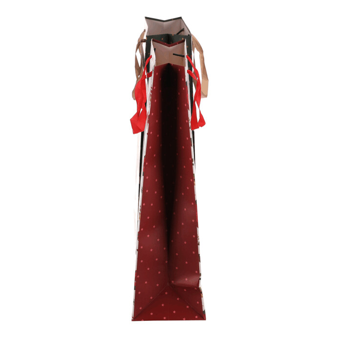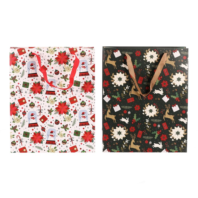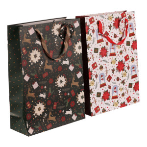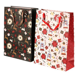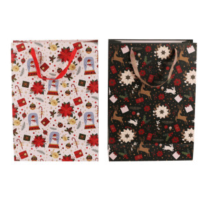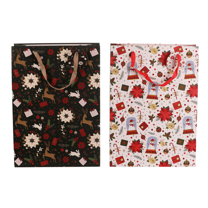 Dotaz na produkt Na splátky ještě dnesDárková papírová taška má bohatý vánoční vzor s větvičkami cesmíny, vánočními růžemi, jeleny, dárky a dalšími svátečními motivy. Nabízí se ve dvou variantách, buď s elegantním černým podkladem, nebo s čistě bílým. Tašky jsou pevné a dobře se nosí. Ušetří vám čas při balení dárků a zároveň vypadají krásně a slavnostně.
