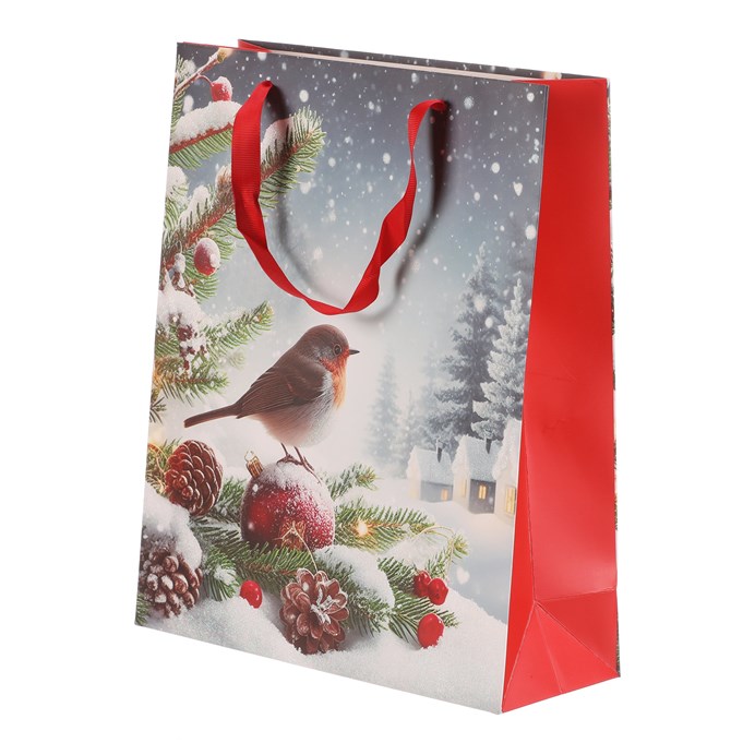 Dotaz na produktPapírová dárková taška s nádherným motivem zasněžené krajiny s roztomilým ptáčkem na větvičce ozdobeného smrčku. Elegantní a praktické řešení pro balení vánočních dárků. Už žádné zdlouhavé balení do papíru, stačí vložit a máte hotovo! Stylová a snadno přenosná, dodá vašim dárkům kouzelný sváteční nádech.