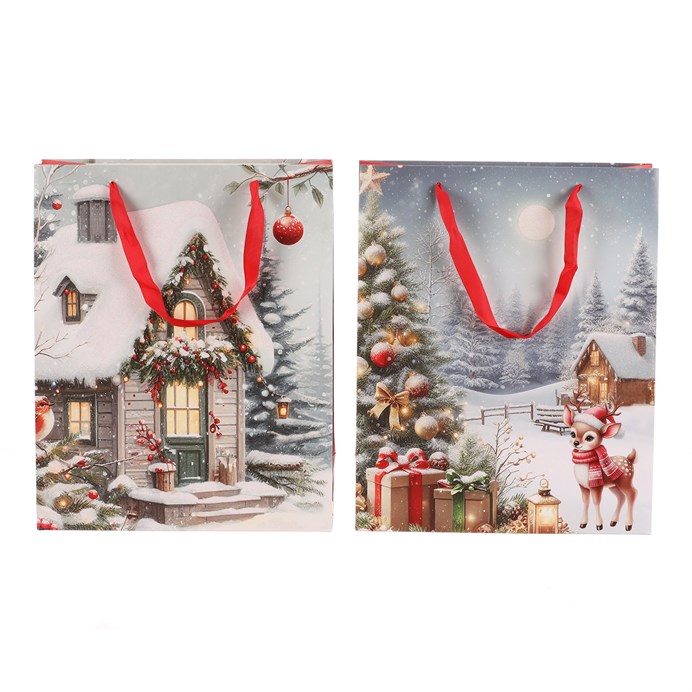 Dotaz na produkt Na splátky ještě dnesDárková papírová taška s nádhernými zimními motivy. Máte na výběr mezi zasněženou chaloupkou nebo vánočním stromkem s dárky a srnečkem. Stylové a praktické řešení, které ušetří čas a dodá vašim dárkům kouzelný vzhled. Už žádné složité a zdlouhavé balení do papíru, stačí vložit a máte hotovo!