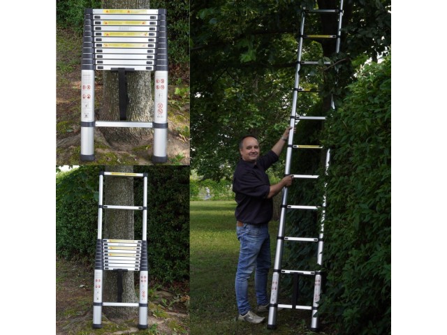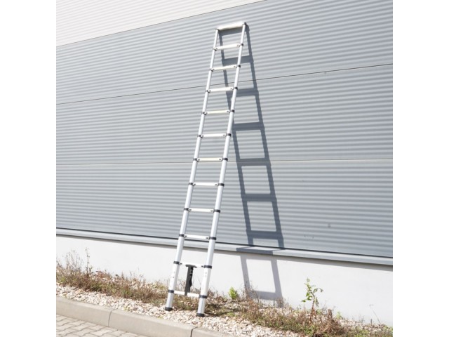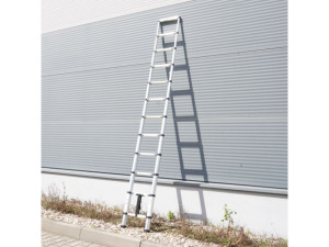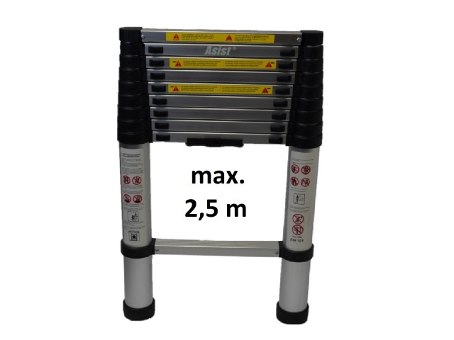 skládací žebřík s nosností 150kg, maximální délka v rozloženém stavu 2,5m, rychlé rozložení a složení, bezpečnostní západky proti samovolnému složení, bezpečnostní atesty (splňuje normu EN 131)