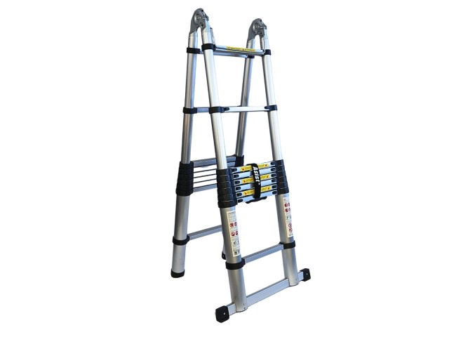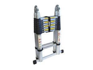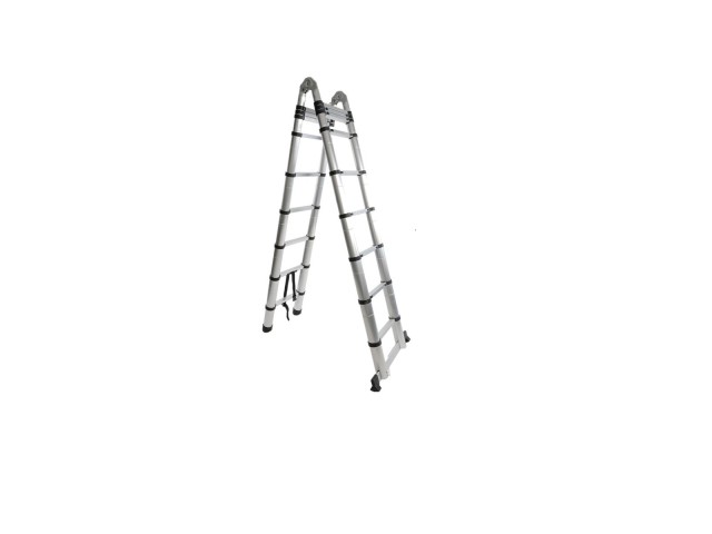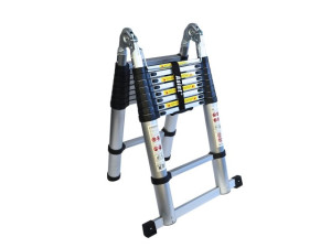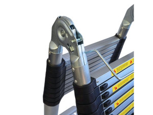 teleskopické štafle-žebřík s možností rozložení max. délkou 5,6m, rychlé rozložení a složení, bezpečnostní západky proti samovolnému složení, bezpečnostní atesty (splňuje normu EN 131)