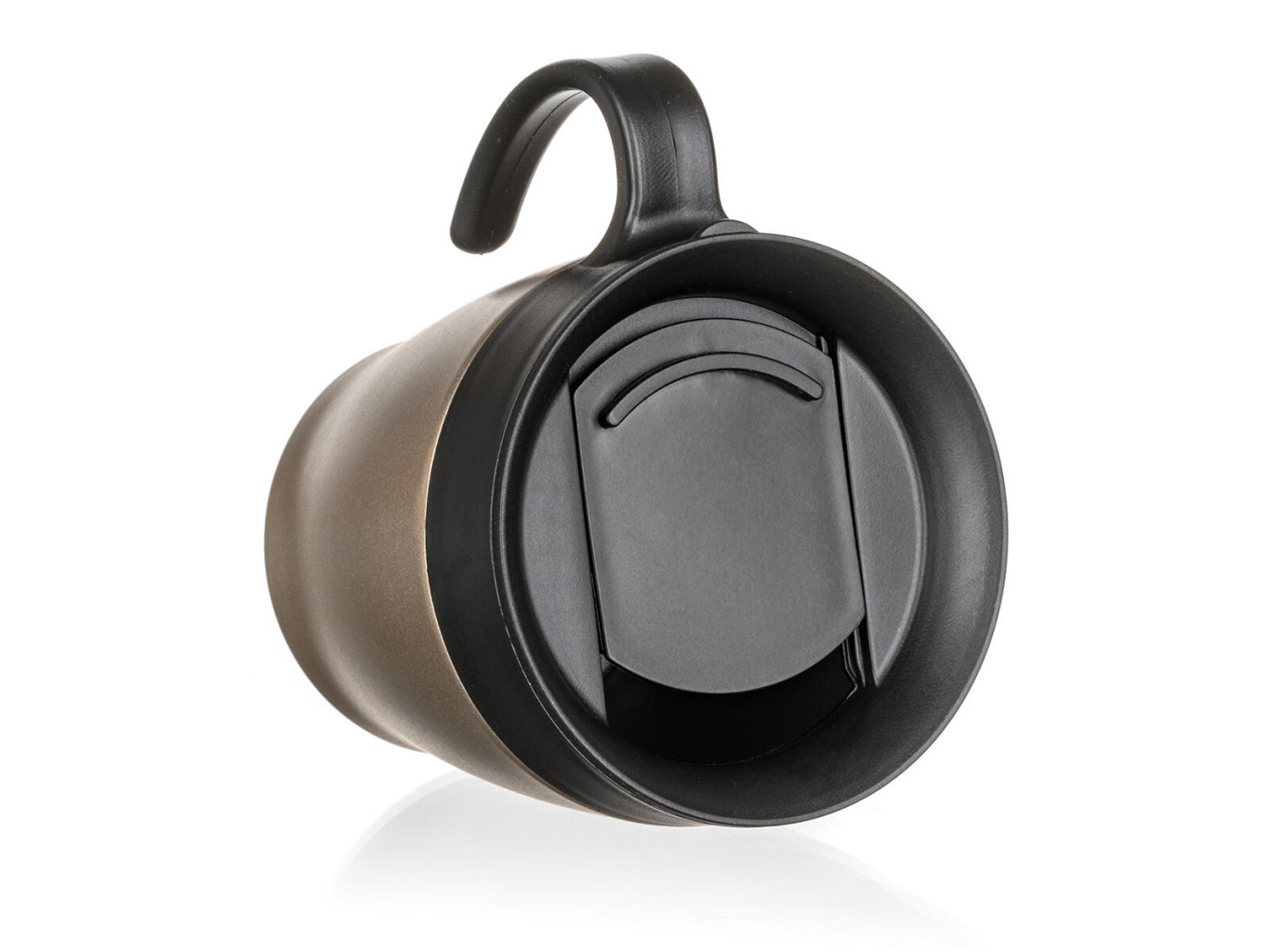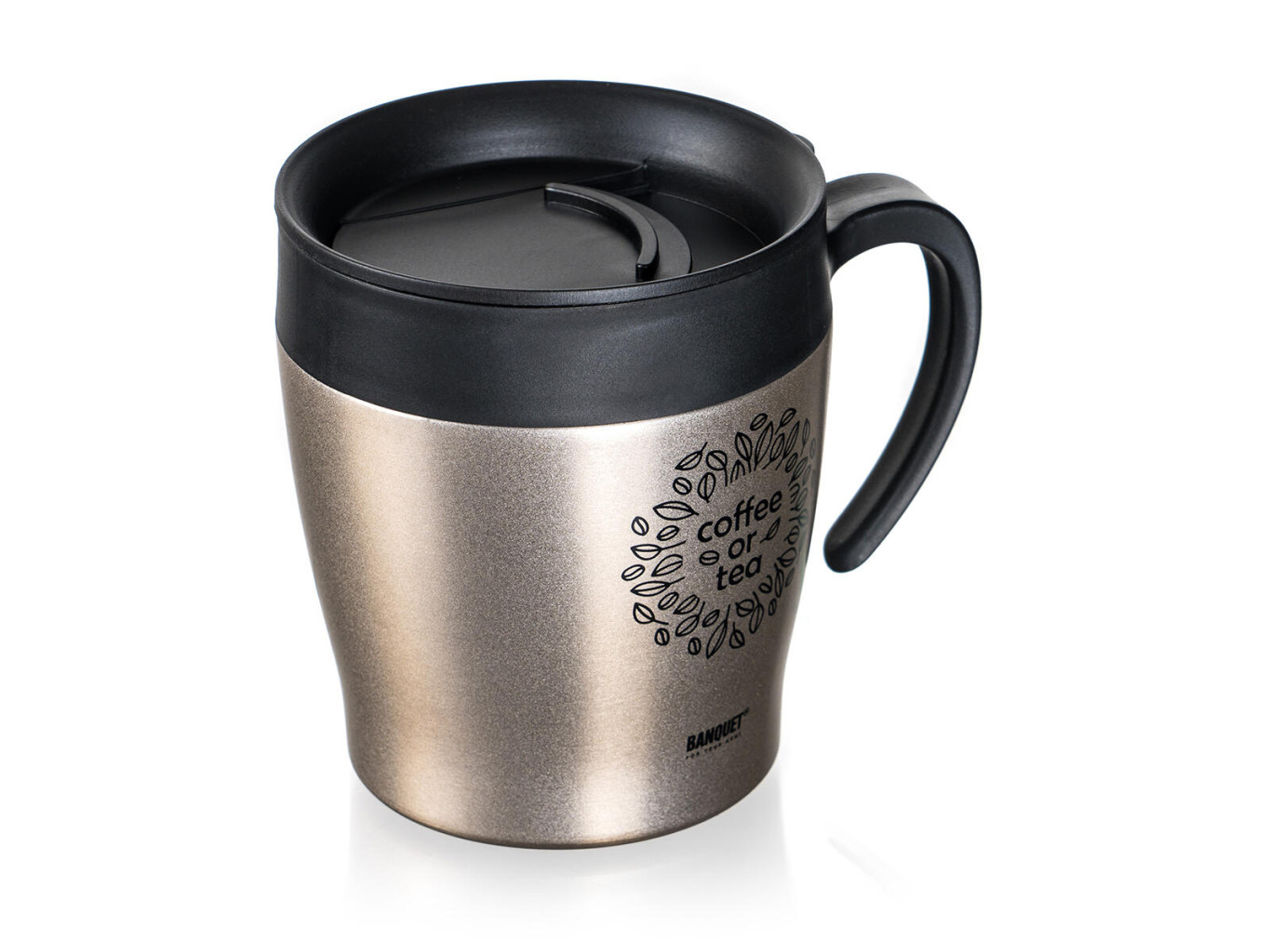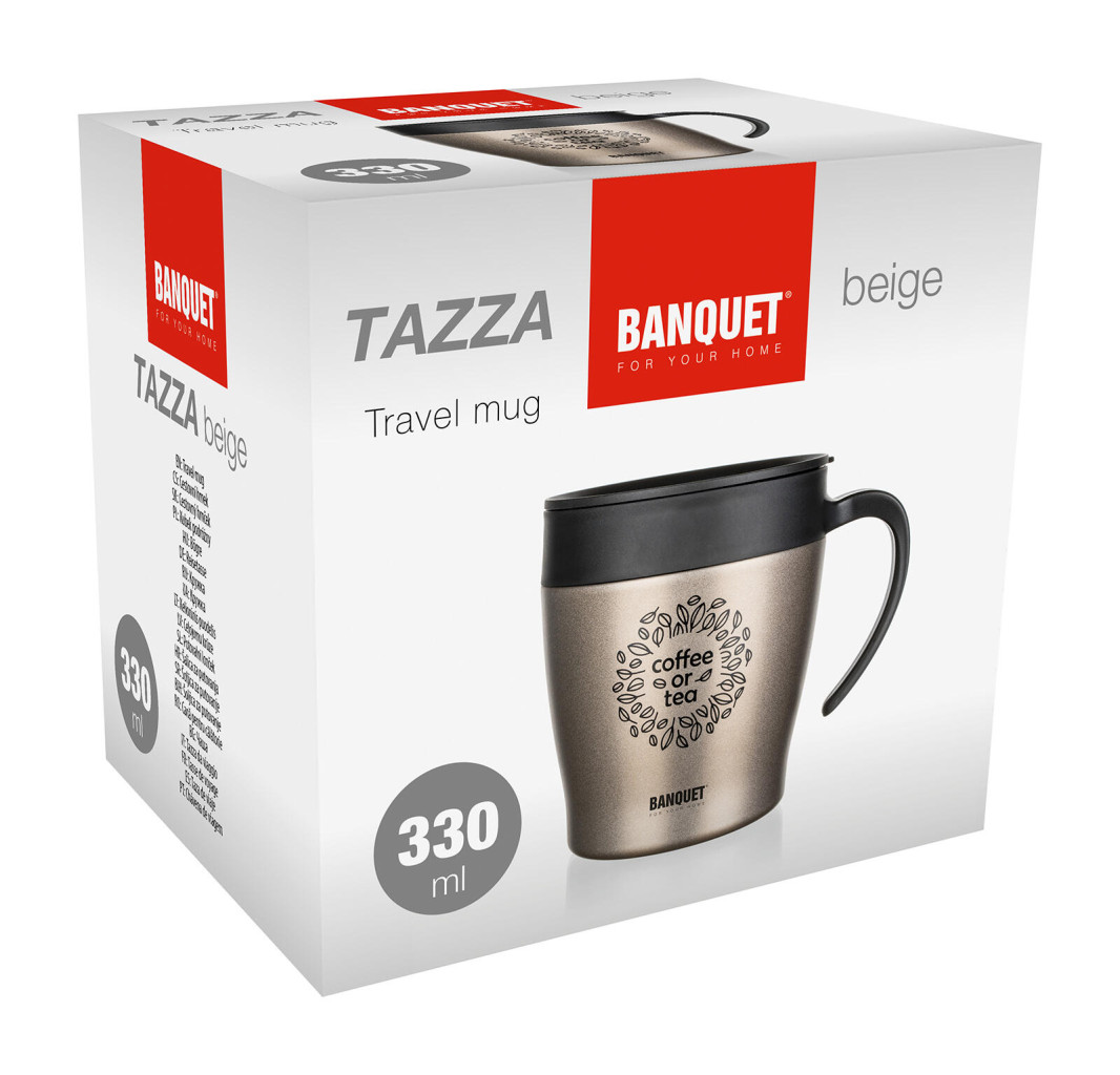 Dvoustěnný cestovní termohrnek TAZZA v béžové metalické barvě, je vhodný na teplé i studené nápoje.