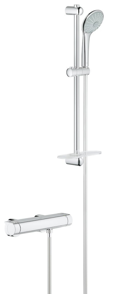 Dotaz na produkt Na splátky ještě dnesTermostatická sprchová baterie Grohtherm 2000 přináší mnohem více než jen zajišťování stálé teploty vody. Její ergonomické ovládací prvky se nesou ve znamení konstrukce navržené pro intuitivní a snadné ovládání. Technologie GROHE CoolTouch zabraňuje nadměrnému zahřátí povrchu baterie a chrání tím vaši citlivou pokožku před popálením. Tlačítko GROHE SafeStop chrání uživatele, především pak děti, před nastavením příliš vysoké teploty vody.* Stejně jako v případě ostatních termostatických baterií GROHE i tato umožňuje snížit spotřebu vody až o 50 %, a to bez nutnosti přijímat kompromisy ve výkonu. Vděčíme za to technologii GROHE EcoJoy a tlačítku EcoButton. Ruční sprcha GROHE Euphoria 110 Massage obsahuje úžasnou funkci navíc: vedle standardních režimů Rain a jeho úsporné varianty SmartRain nabízí také relaxační režim, který se svým pulzujícím proudem postará a uvolňující masáž hlavy a krku. Pokročilý systém, který je součástí technologie DreamSpray, zaručuje vyvážený tok vody ze všech trysek nezávisle na zvoleném režimu proudu. V tomto setu je obsaženo mnoho dalších praktických funkcí a technologií: díky systému GROHE QuickFix je instalace 600mm sprchové tyče rychlá a bezproblémová, jelikož systém umožňuje využít již existujících děr ve zdi nebo je vyvrtat do spár mezi kachličkami. Rozplétání zamotané sprchové hadice bude díky hadici TwistFree minulostí. Spojení systému SpeedClean a chromového povrchu GROHE StarLight zaručuje, že jsou součásti setu snadno udržovatelné a nikdy neztratí svůj zářivý lesk. A přihrádka GROHE EasyReach představuje praktické řešení pro odkládání sprchových gelů a šamponů. *Výchozí nastavení je 38 °C (volitelný omezovač SafeStop Plus je nastaven na 43 °C).